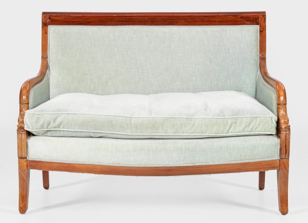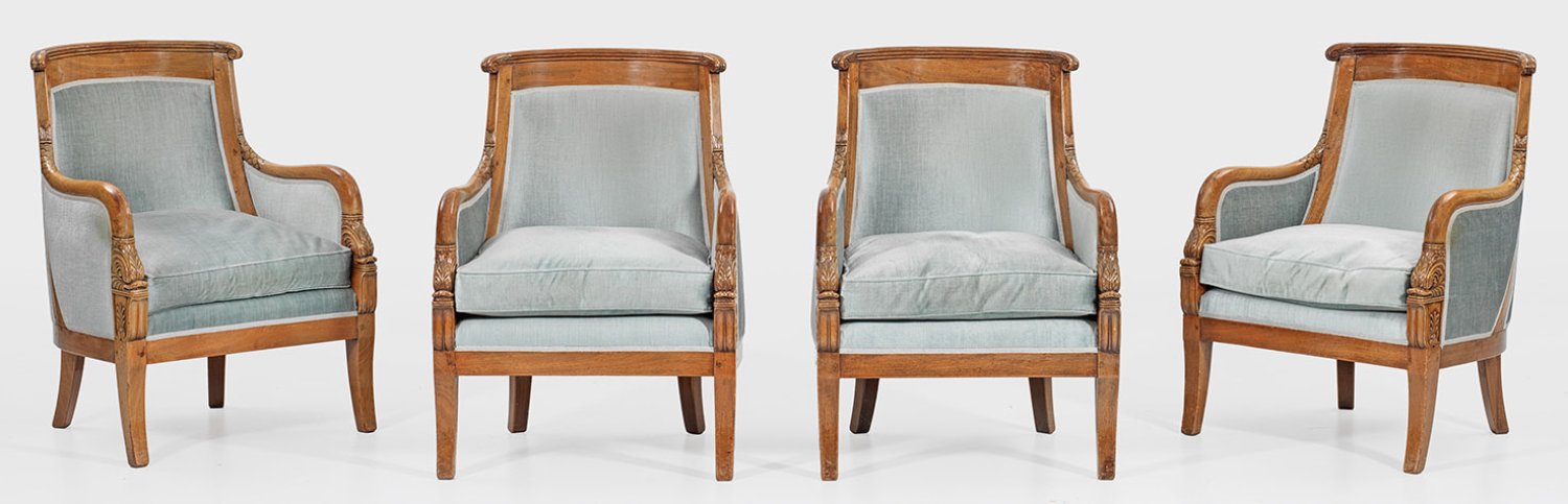 5-tlg.; Sofa und vier Armlehnsessel. Mahagoni, massiv und furniert. Trapezförmige, teilw. leicht bombierte Zarge auf ausgestellten Vierkantbeinen. Geschweifte Armlehnen in Form von stilisierten Delfinen, in gewölbte Rückenlehnenrahmung übergehend. Allseitig gepolstert und bezogen. Sofa-H. 94 cm. 130 cm x 70 cm. Sitz-H. 44 cm.