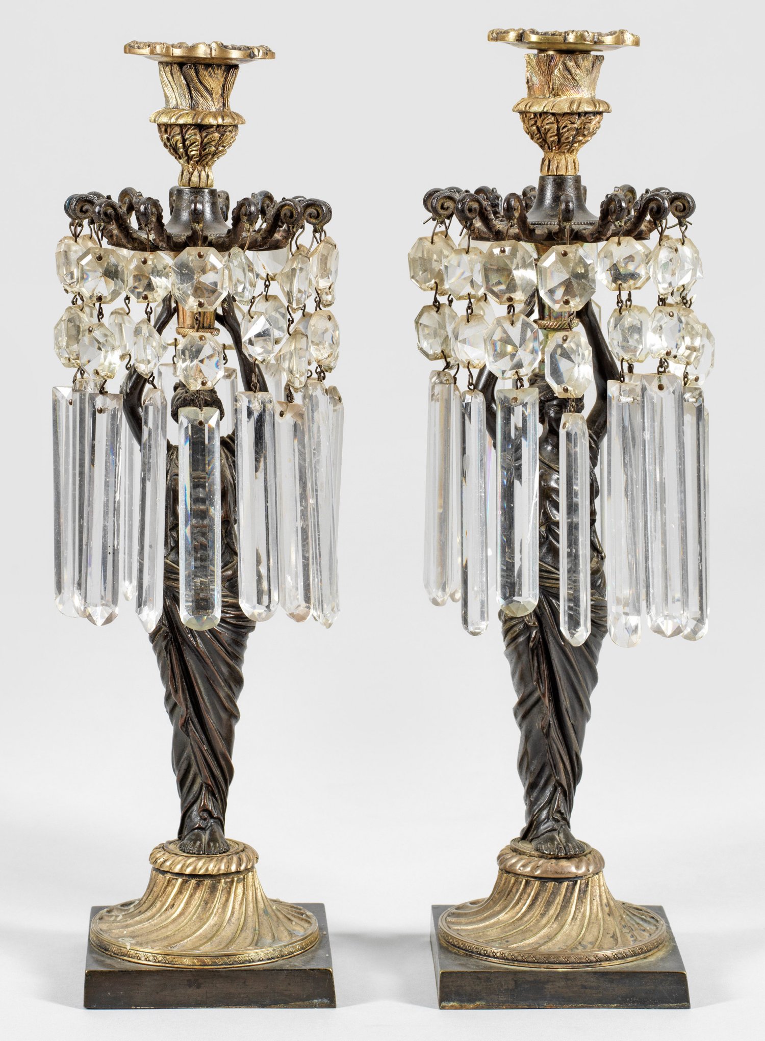 A pair of French bronze and crystal glass Charles X candlesticks. Partly flaws.
