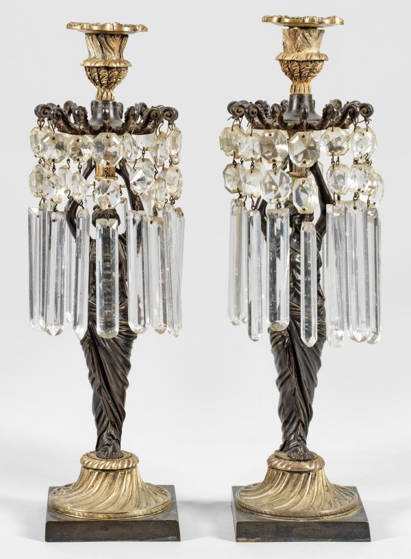 1-flg.; Bronze, teilw. dunkel patiniert und farbloses Kristallglas. Über flachem Podestsockel kannelierte Basis. Davon ausgehend antikisierende Figur als Träger für vasenförmige Tülle. Unterhalb flach geschweifte Voluten mit Behang aus großen facettierten, teilw. besch. Prismen. H. 38,5 cm.
