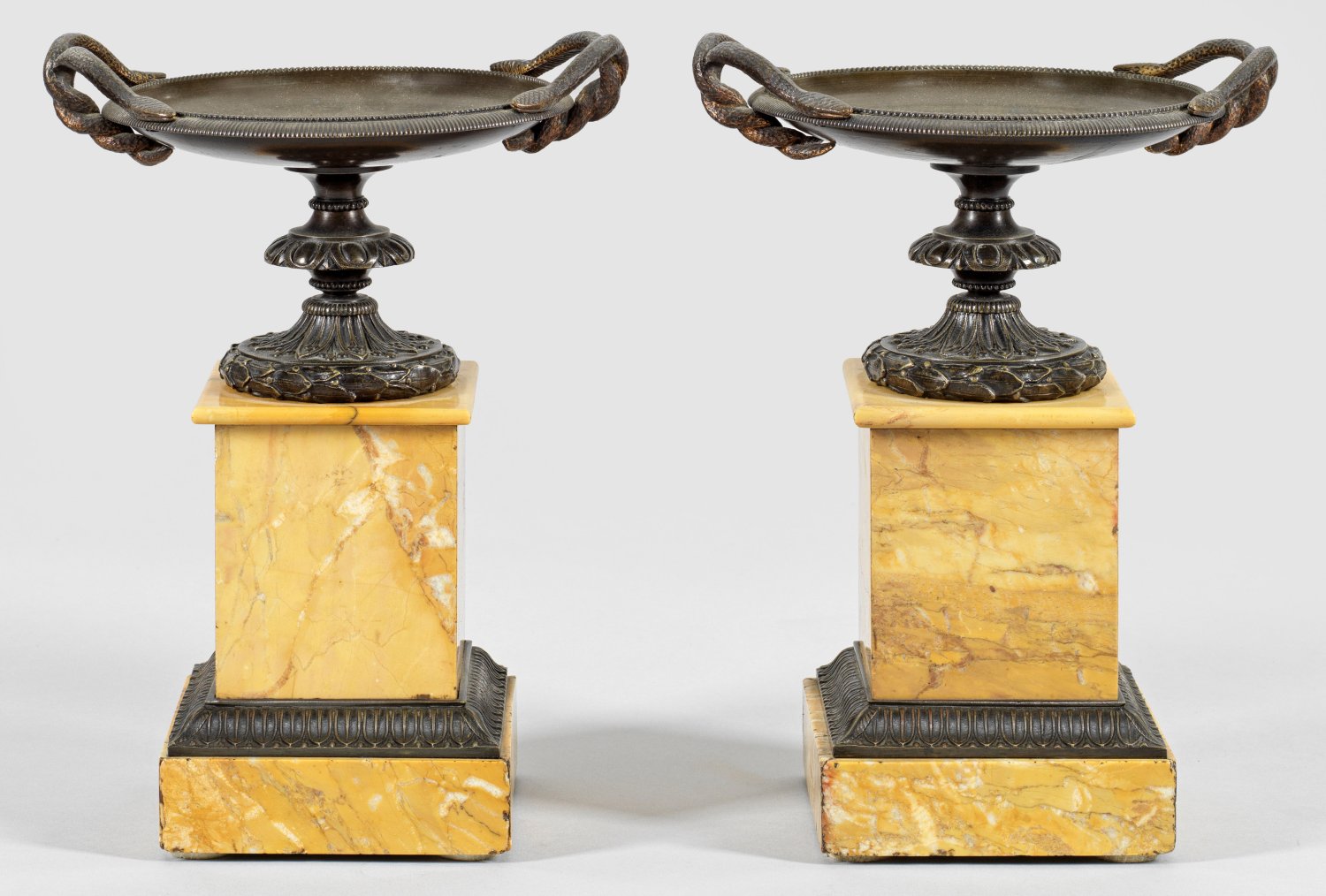 Cremefarbener, rotbraun gemaserter Marmor und Bronze, dunkel patiniert. Über quadratischer Plinthe mit umlaufenden Palmettenfries gekanteter Sockel. Oberhalb kurzer Balusterschaft als Träger für flach gemuldete Schale mit Henkeln aus verschlungenen Schlangenpaaren. H. 27 cm.