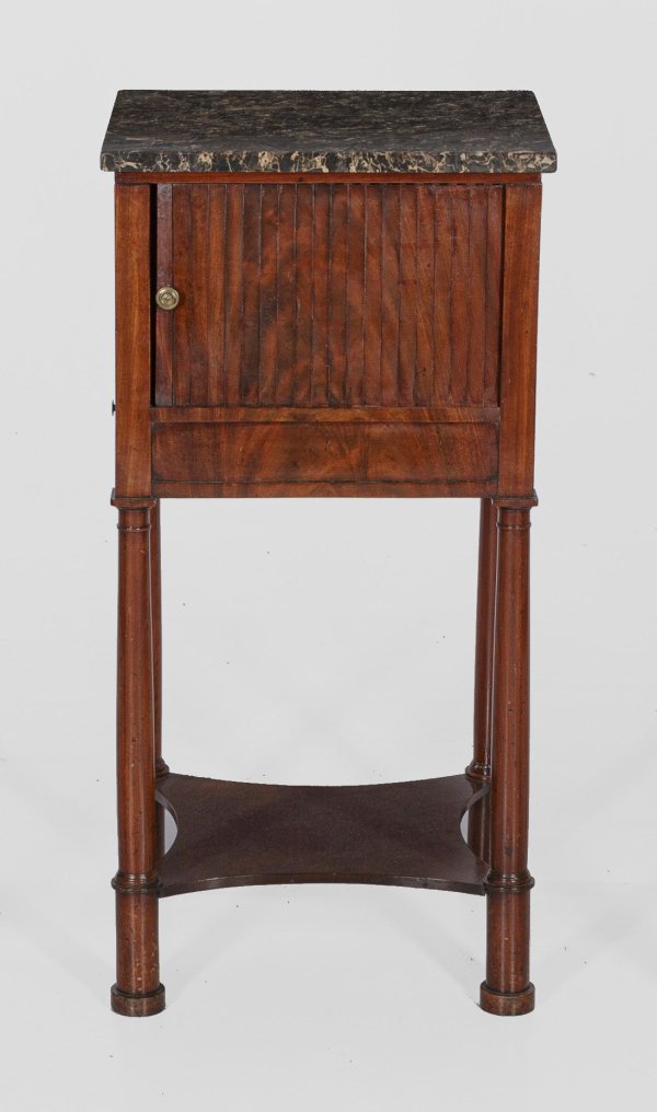Mahagoni, massiv und furniert. Gerader Korpus mit seitlichem Schubfach auf konischen Säulenschäften, unterhalb durch konkav eingezogenes Ablagefach verbunden. In der gegliederten Front Jalousieverschluss. Gering überstehende Deckplatte aus dunkelgrauem, hellgrau gemasertem Marmor. H. 80,5 cm. 40 cm x 34 cm.