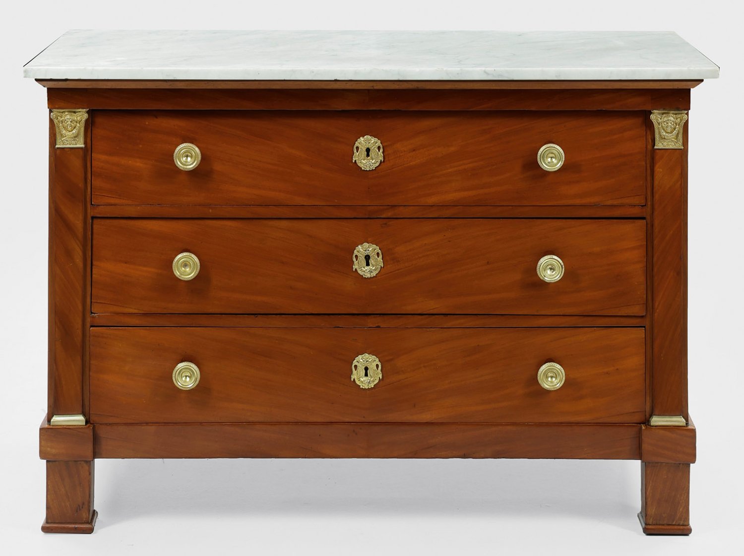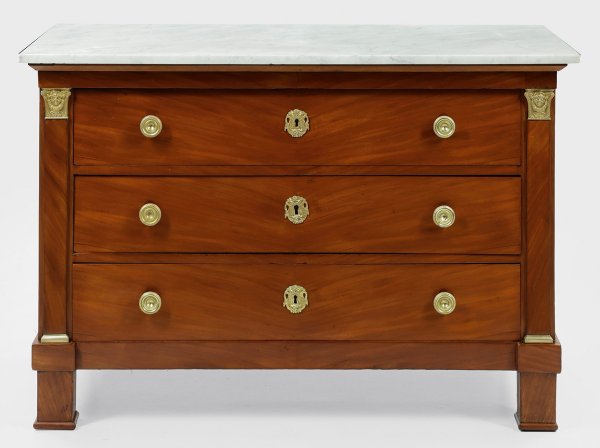 Mahagoni, furniert. Gerader, querrechteckig angelegter Korpus, flankiert von flachen Pilastern mit reliefierten Kapitellen auf schmaler Zarge und gekanteten Füßen. In der gegliederten Front drei breite Schubladen. Rechteckige Deckplatte aus weißem, hellgrau gemasertem Marmor. H. 88 cm. 130 cm x 59,5 cm.