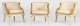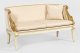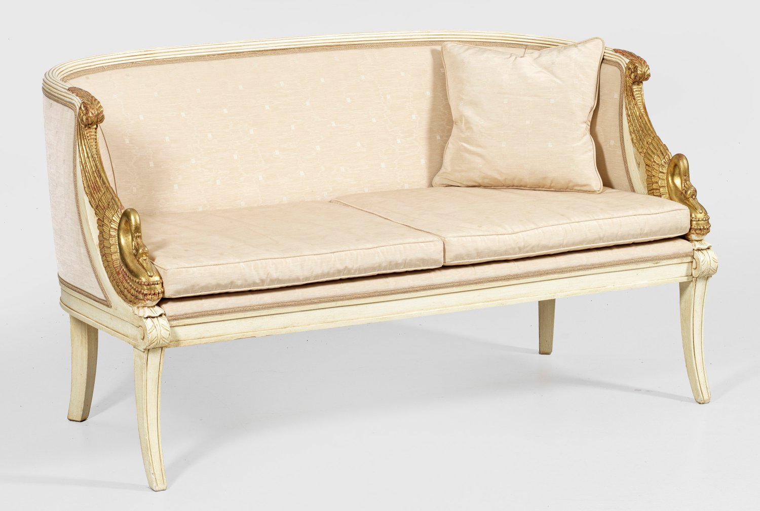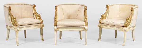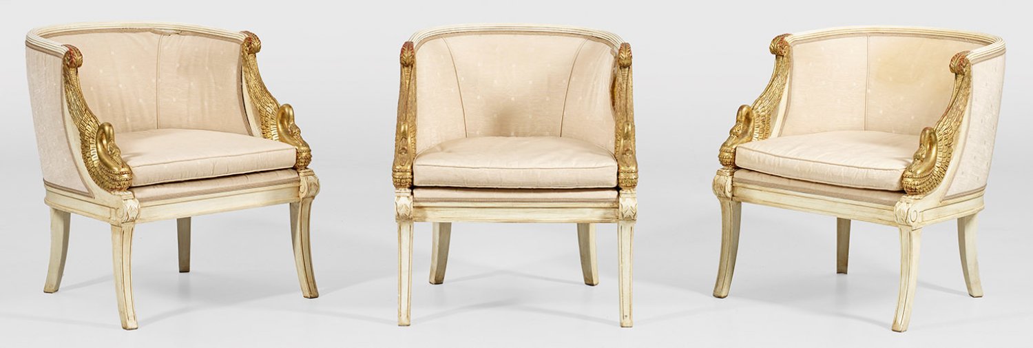5-tlg.; Paar Sofas und drei Sessel. Holz, elfenbeinfarben gefasst und teilw. vergoldet. Gerade Zarge auf ausgestellten Beinen. Schmale Streben mit plastisch gestalteten Schwanenfiguren und gewölbte, godronierte Rückenlehnenrahmung. Allseitig gepolstert und bezogen. Sofa-H. 79 cm. 140 cm x 67 cm. Sitz-H. 44 cm.