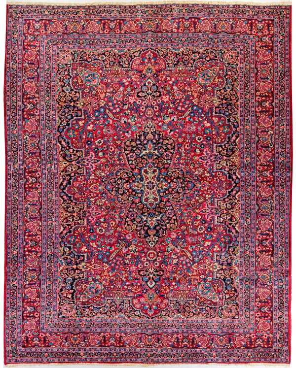 Persien. 1960er Jahre. Wolle auf Baumwolle. Im roten Innenfeld kartuschenförmiges, dunkelgrundiges Zentralmedaillon sowie umlaufend entsprechende, passig geschweifte Rahmung. Flächendeckend dichte Musterung aus Blüten sowie umlaufend breite vielteilige Bordüre. 311 cm x 384 cm.