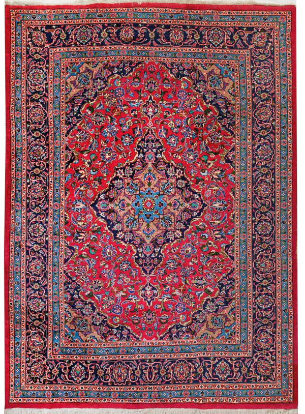 Persien. Wolle auf Baumwolle. Im roten Innenfeld großes, dunkelgrundiges Zentralmedaillon mit Anhängern sowie passig geschweifte Ecklösungen. Flächendeckend dichte Musterung aus üppigen Palmettenranken sowie umlaufend breite, korrespondierende Bordüre mit hellblauen Nebenbordüren. 286 cm x 211 cm.
