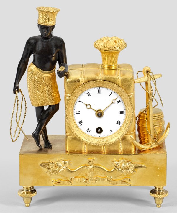 Bronze, vergoldet bzw. schwarz patiniert. Über querrechteckig angelegtem Sockel mit Balusterfüßen vollplastische, allegorische Darstellung Amerikas auf das rechteckige Uhrengehäuse in Form eines großen verschnürten Pakets gestützt. Daneben Anker und Fass als Attribute der Seefahrt. Profilgerahmtes Zifferblatt sowie Werk mit Echappement. Rest. mit Erg.; H. 19 cm. 14 cm x 6 cm.