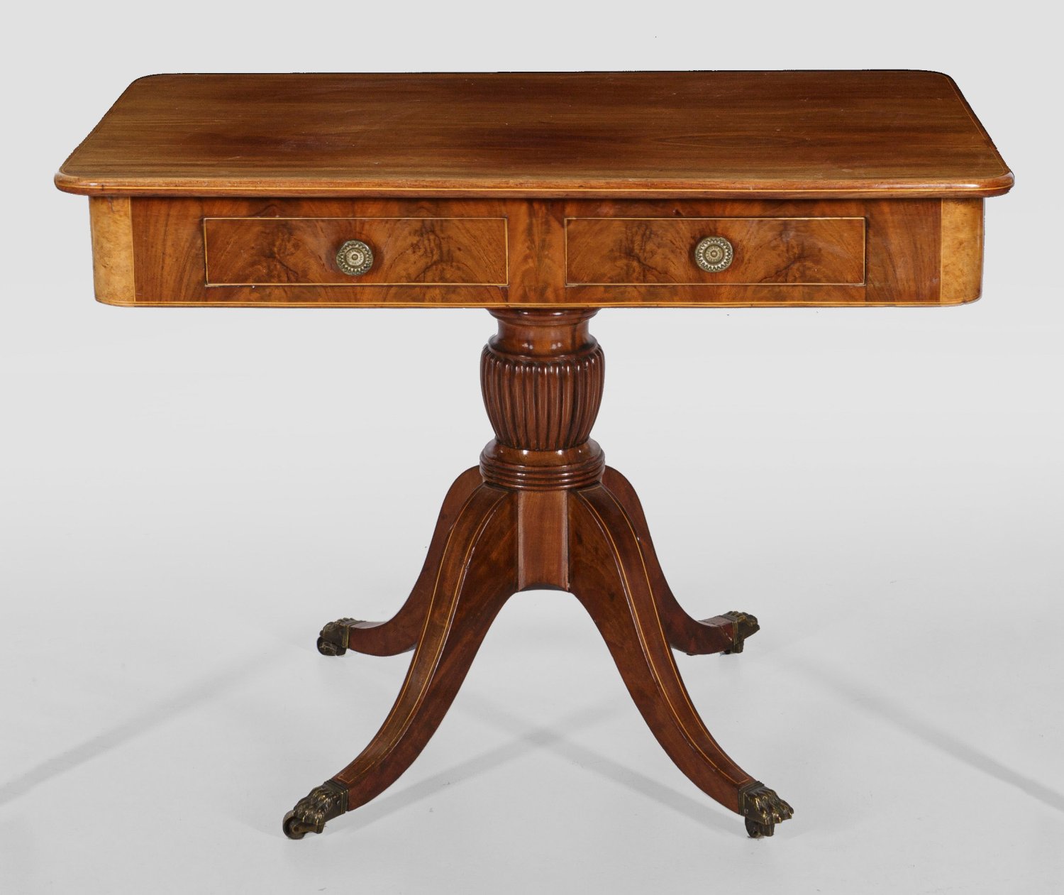 Mahagoni und Ahornmaser, furniert sowie schmale Fadeneinlagen. Über hohen, geschweift ansteigenden Beinen mit reliefplastischen Tatzenfüßen und Rollen kurzer, teilw. godronierter Balusterschaft als Träger für geraden, zweischübigen Zargenkasten. Gering überstehende Deckplatte mit gerundeten Ecken. H. 72 cm. 95 cm x 58 cm.