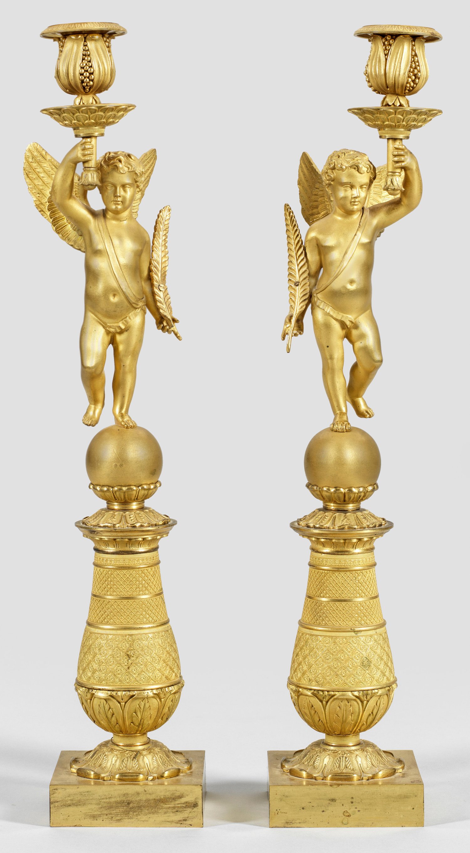 Gegenstücke. 1-flg.; Bronze, ziseliert und vergoldet. Über quadratischem Sockel mehrfach gegliederter Balusterschaft mit reliefiertem Blattwerk und unterschiedlichen Ornamentbändern. Vollplastische Darstellung eines Puttenknaben mit Palmwedel als Träger für Leuchtmittel aus vasenförmiger Tülle über gemuldeter Traufschale. H. 49,5 cm.