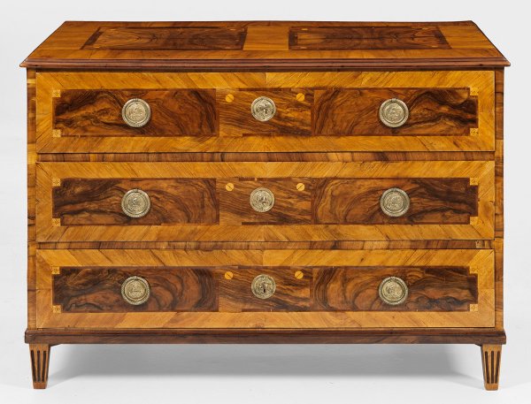 Nussbaum, furniert sowie Einlagen aus Pflaumenholz. Gerader, querrechteckig angelegter Korpus auf konischen, kannelierten Vierkantfüßen. In der gegliederten Front drei breite Schubladen. Gering überstehende, profilierte Deckplatte. Flächendeckend breit gerahmte Furnierfelder, von Bandeinlagen begrenzt. H. 85 cm. 119 cm x 59 cm.