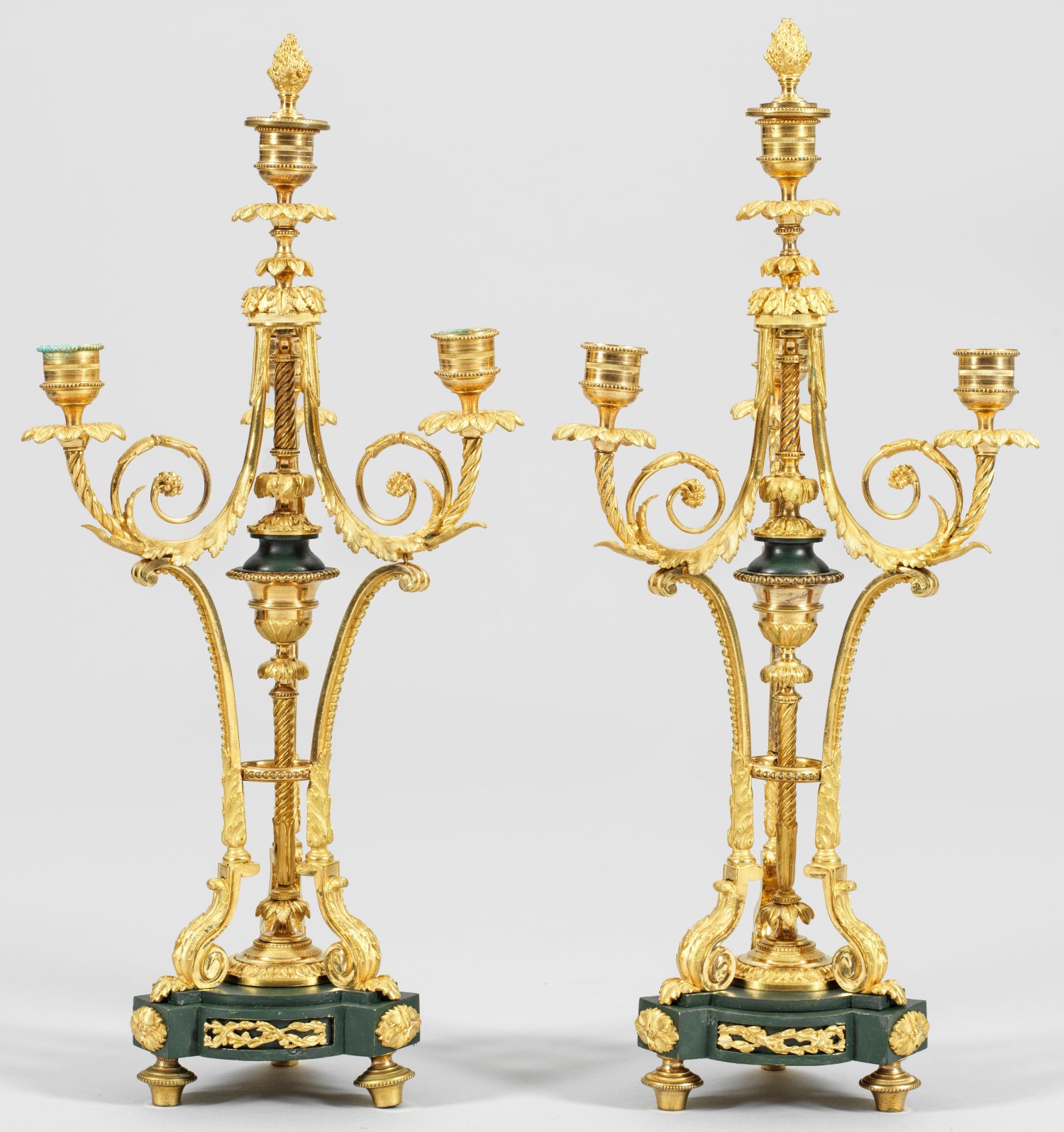 3- bzw. 4-flg.; Bronze, fein ziseliert und feuervergoldet sowie teilw. tannengrün lackiert. Über gestuft ansteigendem Rundsockel mit applizierten Rosettenmotiven offen gestalteter Korpus aus gegeneinander gestellten, blattreliefierten und teilw. eingerollten Voluten sowie mehrfach gegliedertem, in sich gedrehten Balusterschaft als Träger für vasenförmige Tüllen. Rest.; H. 48,5 cm.
