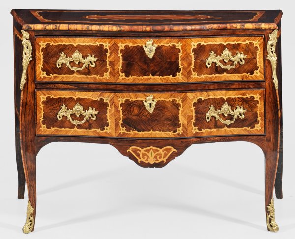 Palisander und Rosenholz, furniert sowie Einlagen aus Ahorn. Dreiseitig leicht bombierter Korpus, flankiert von schmalen Ecklisenen, in geschweifte Beine übergehend. In der gegliederten Front zwei breite Schubladen. Gering überstehende Deckplatte. Flächendeckend breit gerahmte, gespiegelt angeordnete Furnierfelder, von Volutenbändern begrenzt. H. 84,5 cm. 120 cm x 55 cm.
