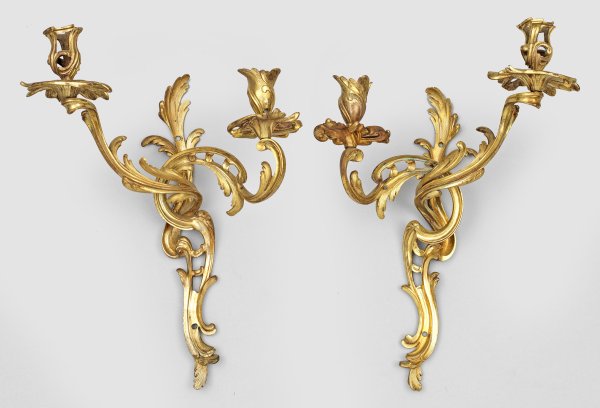 Gegenstücke. 2-flg.; Bronze, vergoldet. Schmale, durchbrochen gearbeitete Wandschilder, in stark geschwungene Leuchterarme mit vasenförmigen Tüllen übergehend. Bohrung für Elektrifizierung. H. 39 cm.