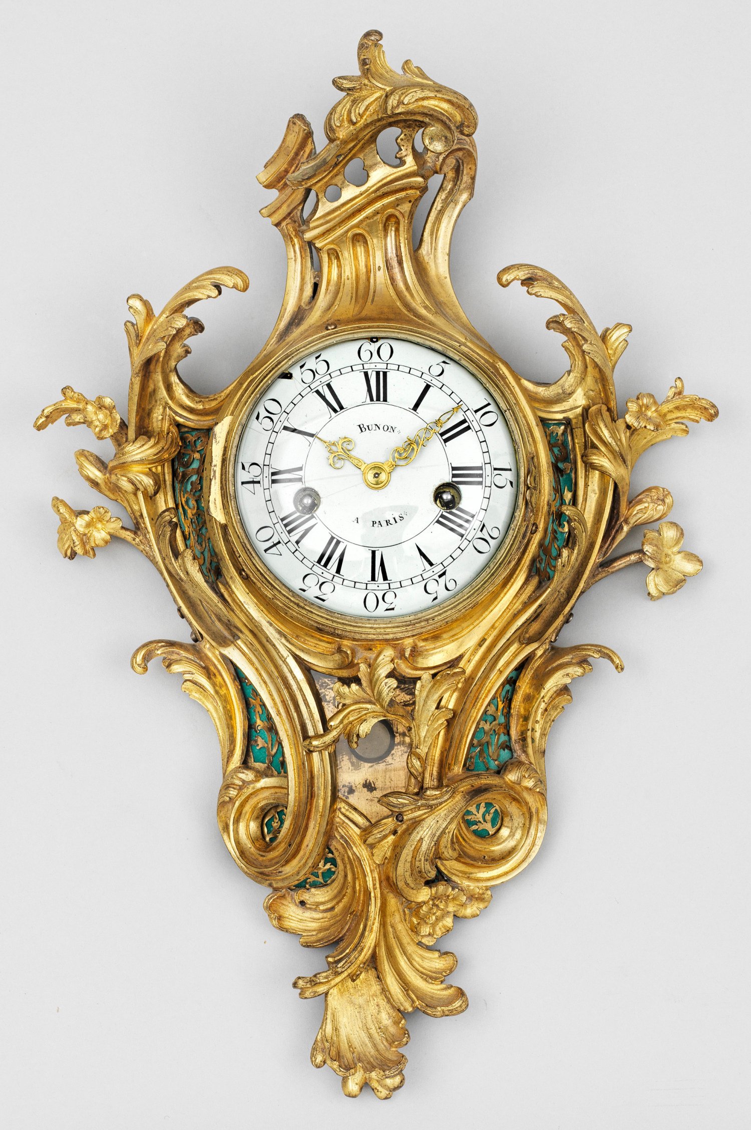 Bronze, feuervergoldet. Balusterförmiger, asymmetrisch angelegter Korpus aus üppigen, teilw. eingerollten Blattvoluten, Blüten und floral durchbrochen gearbeitetem Gitterwerk. Profilgerahmtes, verglastes Zifferblatt, bez. Bunon à Paris. Werk mit Fadenaufhängung sowie Halbstundenschlag auf Glocke. H. 53 cm.