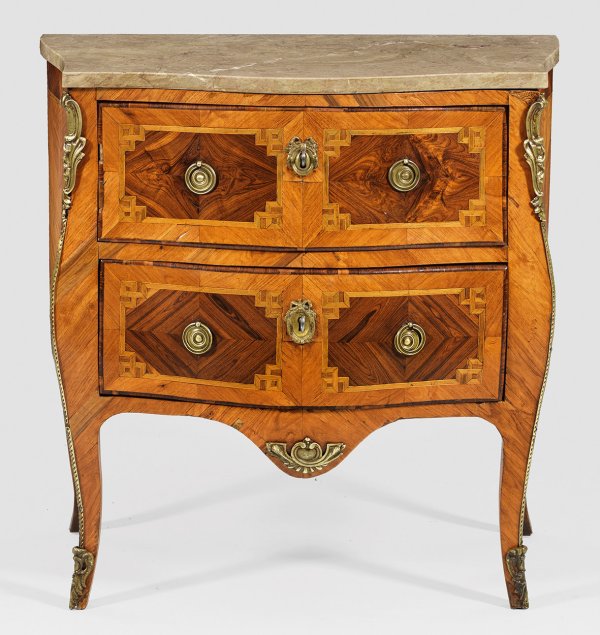 Nussbaum, Obstholz und Palisander, furniert sowie grün gefärbte Einlagen. Dreiseitig bombierter Korpus, flankiert von ausgezogenen Ecklisenen, in entsprechende Beine übergehend. In der gegliederten Front zwei Schubladen mit mäanderförmig angelegten Bandeinlagen. Flächendeckend gespiegelt angeordnete Furnierfelder. Deckplatte aus hellgrau gemasertem Marmor. H. 80 cm. 78 cm x 40 cm.