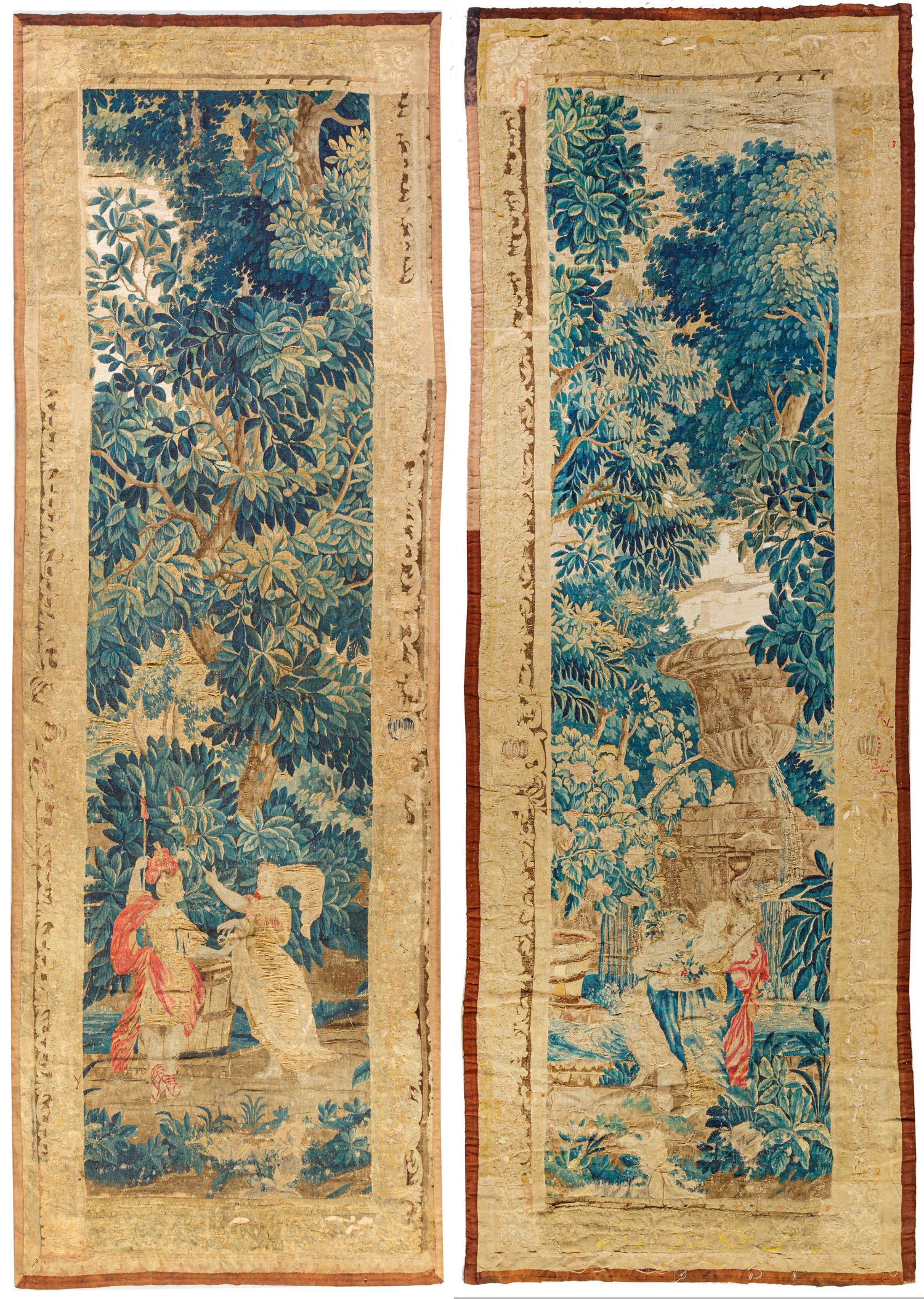 Wolle in unterschiedlichen Beige-, Grün- und Brauntönen sowie wenig Rot. Im Innenfeld flächendeckend dicht angelegte Darstellungen von idealisierten Parklandschaften mit großen Bäumen und teilw. Brunnenarchitektur. Im Vordergrund jeweils unterschiedliche Figurengruppen. Umlaufend breite Bordüre aus Rankenwerk. Teilw. rep.; Hinterlegt. Je 368 cm x 132 cm.