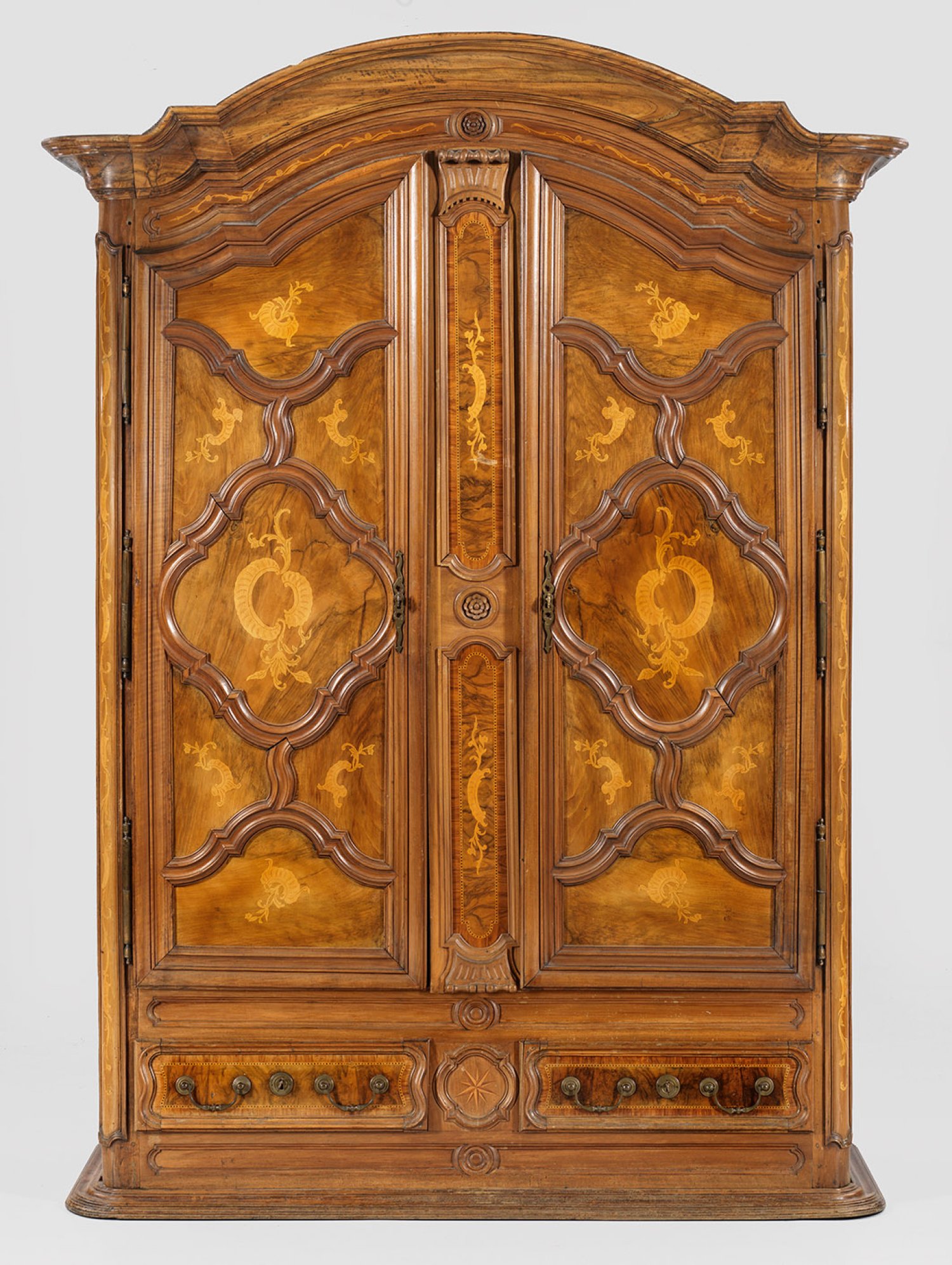 Nussbaum, massiv sowie kontrastierende Einlagen. Gerader, hochrechteckiger, kassettierter Korpus mit gerundeten Lisenen auf breiter Profilzarge und flachen Scheibenfüßen. In der gegliederten Front zwei Schubfächer sowie zwei hohe, ornamental profilierte Türen mit eingelegten Rocaillen. Vorkragendes, mittig hochaufgeworfenes Kranzgesims. Erg.; H. 257 cm. 189 cm x 66 cm.