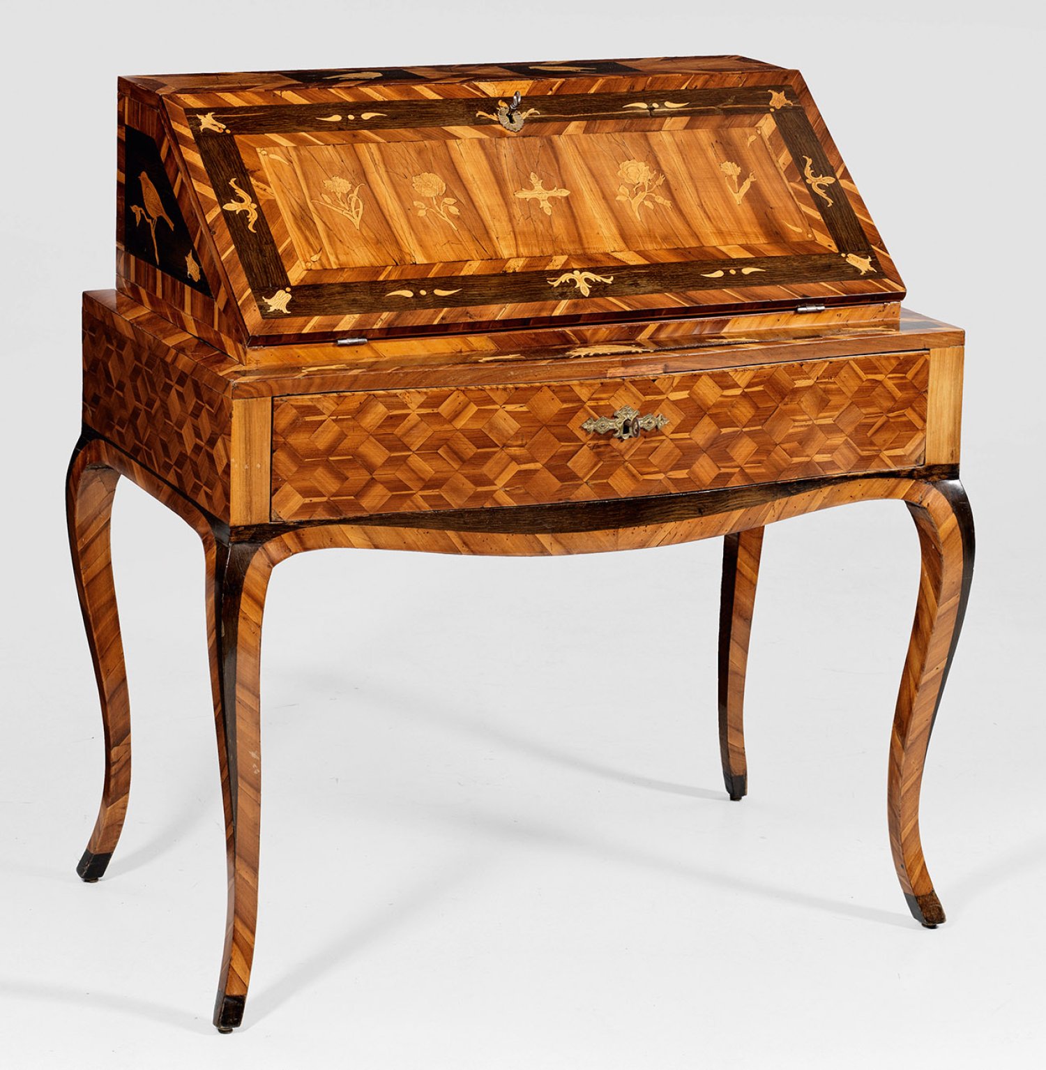 Pflaumenholz, furniert sowie Einlagen aus unterschiedlichen Edelhölzern. Gerader, einschübiger, in der Front bombierter Zargenkasten auf geschwungenen Beinen. Zurückgesetzter Aufsatz mit schräggestellter, aufklappbarer Arbeitsplatte. Dahinter gestaffelte Facheinteilung. Flächendeckend breit gerahmte Furnierfelder sowie eingelegte Blüten, Vögel und Wildtiere. H. 98 cm. 89 cm x 50 cm.