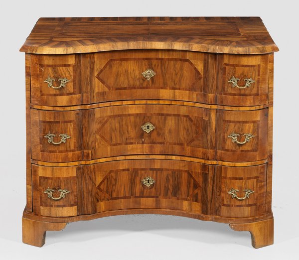 Nussbaum, furniert sowie Einlagen aus Pflaumenholz. Gerader, querrechteckig angelegter Korpus aus schmaler Zarge und gesägten Füßen. In der gegliederten Front drei gegenläufig geschweifte Schubladen. Gering überstehende Deckplatte. Flächendeckend breit gerahmte Furnierfelder, von Bandeinlagen begrenzt. H. 77 cm. 97 cm x 60 cm.