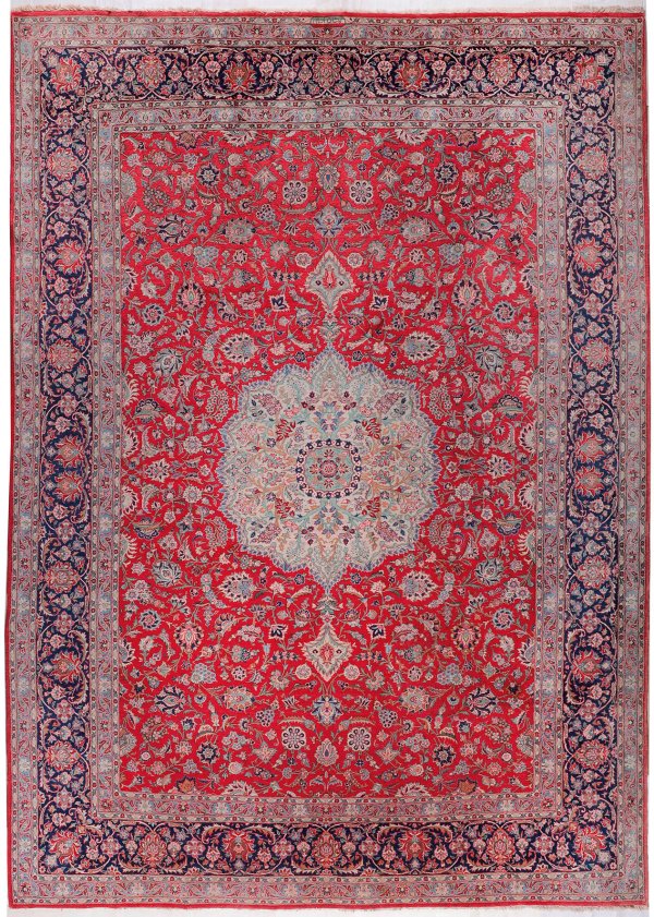 Persien. Mitte 20. Jh.; Korkwolle auf Baumwolle. Im hellroten Innenfeld großes, pastellfarbenes Rundmedaillon mit Anhängern. Flächendeckende Musterung aus Palmettenranken. Umlaufend dunkelblaue Hauptbordüre aus Palmetten und Lanzettblättern, flankiert von schmalen Nebenbordüren. Sign.; Secrilit-Schutzurkunde von 1984. 395 cm x 280 cm.