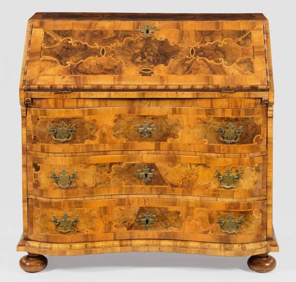 Nussbaum, furniert sowie Einlagen aus Eschenholz. Gerader, querrechteckig angelegter Korpus auf schmaler Profilzarge und gedrückten Füßen. In der gegliederten Front drei doppelt geschweifte Schubladen sowie ausziehbare Stützen für schräggestellte, abklappbare Arbeitsfläche. Dahinter gestaffelte Facheinteilung. Flächendeckend breit gerahmte Furnierfelder, von verschlungenen Bandeinlagen begrenzt. H. 97 cm. 106 cm x 57 cm.