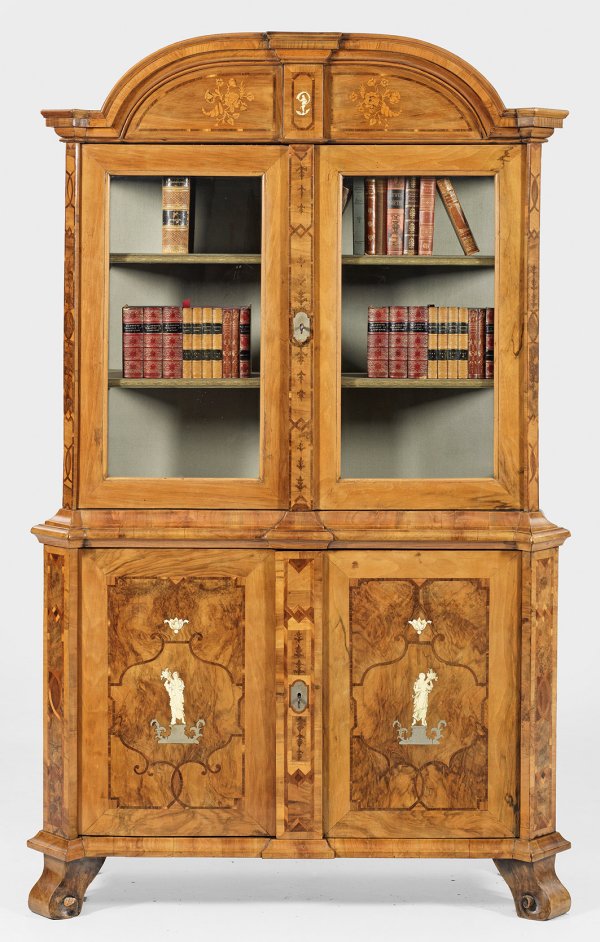Nussbaum furniert sowie Einlagen aus unterschiedlichen Hölzern, Elfenbein und Zinn. Gerader, rechteckig angelegter Korpus, flankiert von breiten, schräggestellten Ecklisenen aus schmaler Zarge und Volutenfüßen. In der gegliederten Front von Bandelwerk umgebene figurale Einlagen. Oberhalb dreiseitig verglaster, zweitüriger Vitrinenaufsatz mit vorkragendem, mittig segmentartig aufgeworfenem Profilgesims. Flächendeckend breit gerahmte Furnierfelder, von Bandeinlagen begrenzt. H. 204 cm. 125 cm x 45 cm.