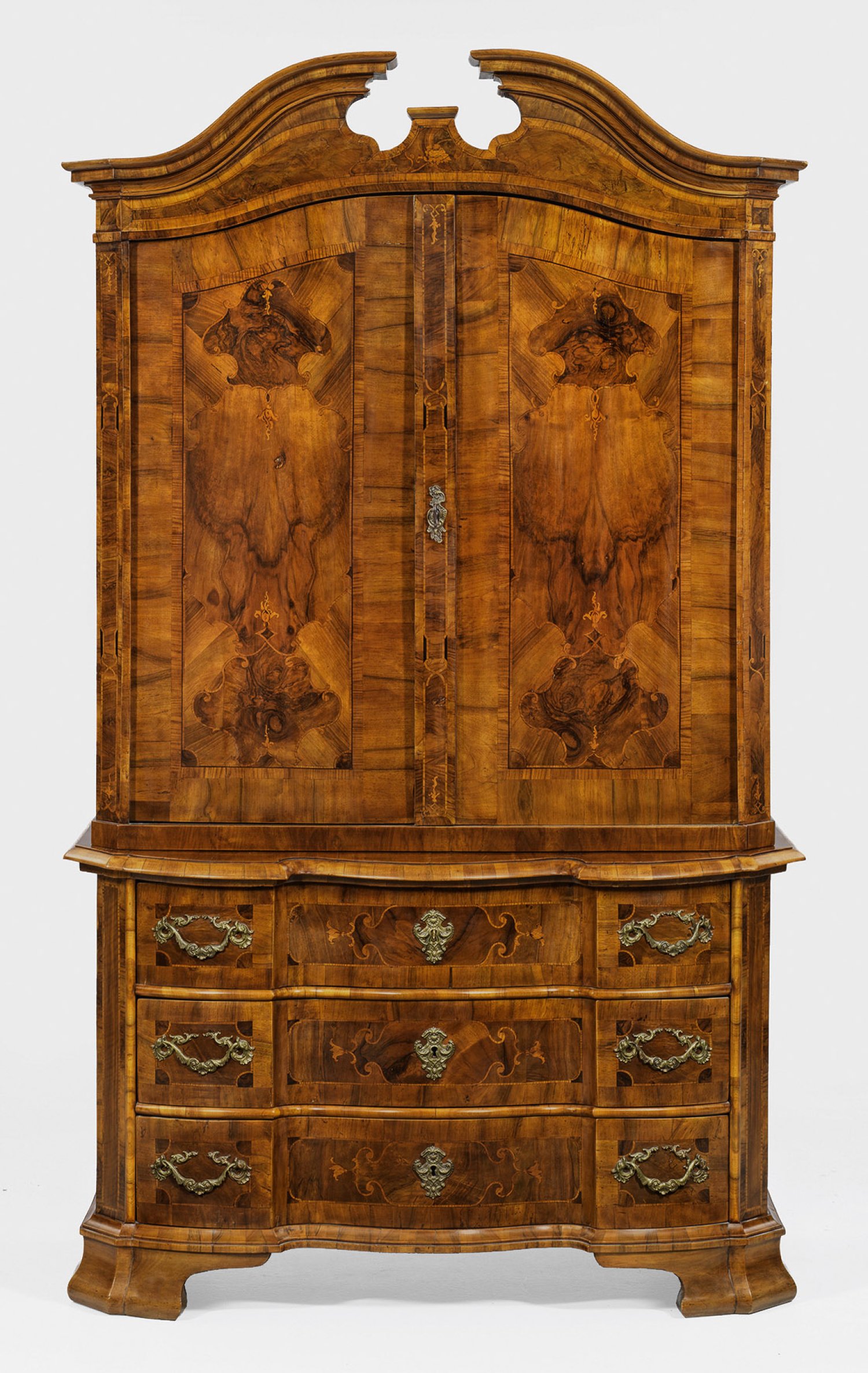 Nussbaum, furniert sowie Einlagen aus Eschenholz. Gerader, querrechteckig angelegter Korpus auf schmaler Kehlzarge und gewulsteten Füßen. In der gegliederten Front drei breite, gegenläufig geschweifte Schubladen, flankiert von schräggestellten Ecklisenen. Korrespondierende, weit überstehende Deckplatte. Zurückgesetzter, zweitüriger Aufsatz mit vorkragendem, mittig hochaufgeworfenem Kranzgesims und gesprengtem Giebel. Flächendeckend breit gerahmte Furnierfelder, in der Front mit verschlungenen Bandeinlagen und intarsierten Kelchblüten. H. 217 cm. 129 cm x 59 cm.