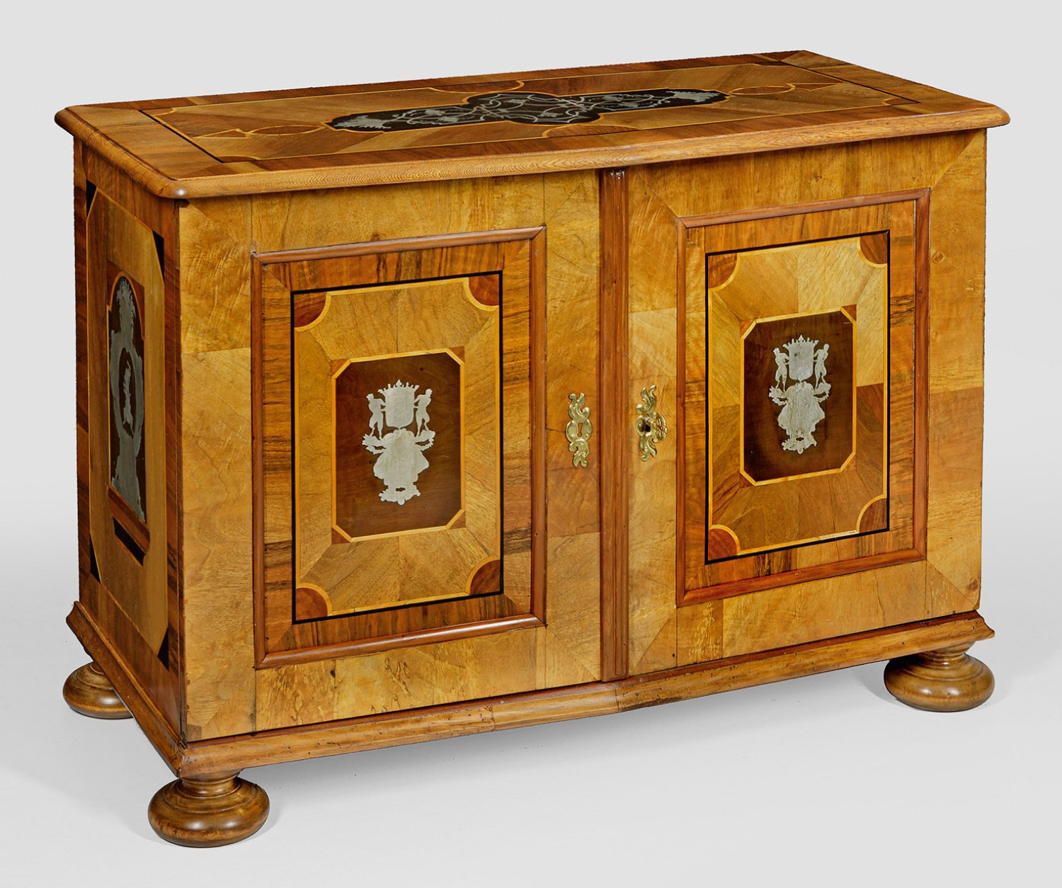 Nussbaum, auf Eichenholz furniert sowie Einlagen aus unterschiedlichen Hölzern und graviertem Zinn. Gerader, querrechteckig angelegter Korpus auf schmaler Zarge und gedrückten Füßen. In der gegliederten Front zwei leicht schräggestellte Türen. Entsprechende, leicht überstehende Deckplatte. Flächendeckend breit gerahmte Furnierfelder mit großen gravierten Zinnreserven, von Bandeinlagen begrenzt. Rest.; H. 79 cm. 111 cm x 58 cm.