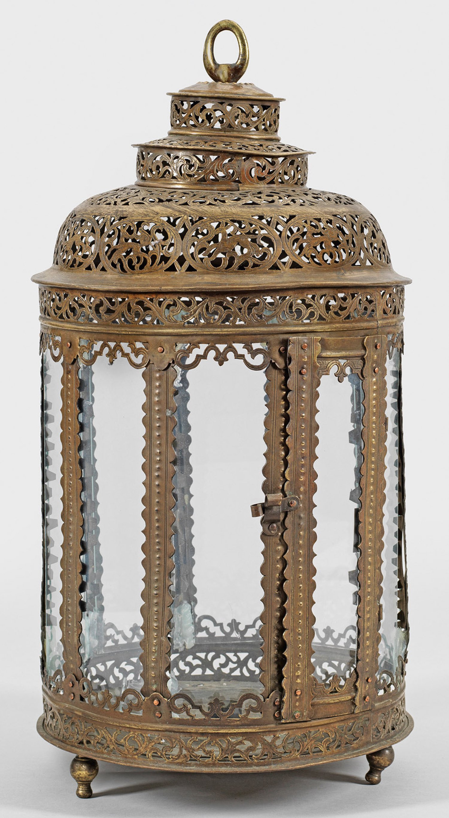 Messing und farbloses Glas. Über drei Füßen balusterförmiger, umlaufend gekanteter, verglaster Korpus. Wandung aus schmalen Stegen und ornamental durchbrochen gearbeitetem Gitterwerk in Form von reliefierten Voluten- und Blattranken sowie stilisierten Tieren. Kuppelförmig gestufter oberer Abschluss mit Aufhängung. Bodenplattenunterseite reliefplastisch verziert mit zentraler, großer Blütenrosette und umlaufendem Bandelwerk. Innen eine Tülle als Träger für Leuchtmittel. Glasscheiben später ergänzt. Ein Fuß erneuert. H. 68 cm. D. 34,5 cm.