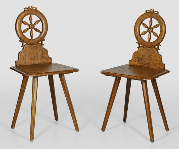 Eichenholz. Trapezförmige, profilierte Sitzfläche auf schräggestellten, spitz zulaufenden, gekanteten Beinen. Balusterförmige, durchbrochen gearbeitete Rückenlehne aus schleifenbekröntem Radmotiv. Sitz-H. 48 cm.