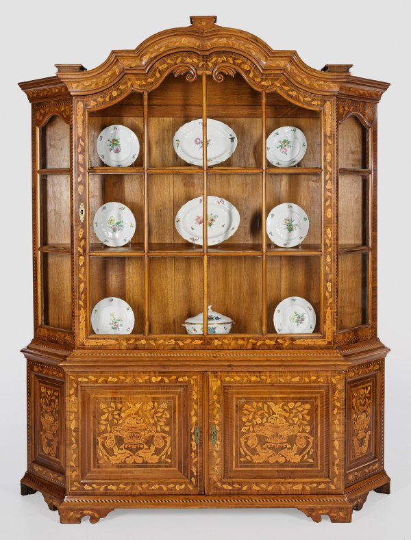 Nussbaum, auf Eichenholz furniert sowie Einlagen aus Ahorn. Gerader, querrechteckig angelegter Korpus mit schräggestellten Seiten auf schmaler Kehlzarge und gesägten Füßen. In der gegliederten Front zwei Türen. Oberhalb hoher, eintürig sprossenverglaster Vitrinenaufsatz mit geschweift ansteigendem, mittig hoch aufgeworfenem Gesims. Flächendeckende Marketerie aus Blüten, Volutenmotiven und Vögeln. H. 222 cm. 181 cm x 48 cm.