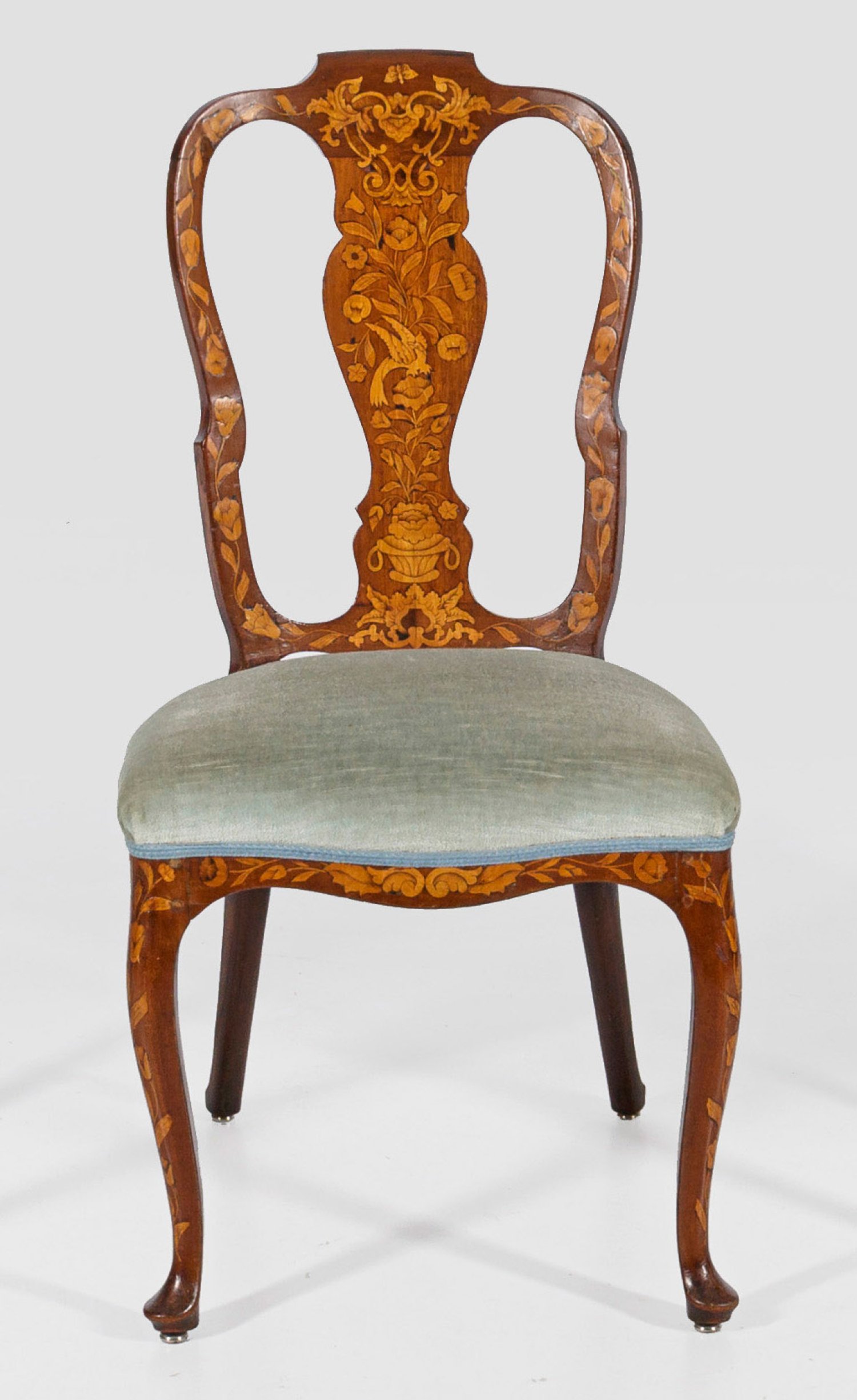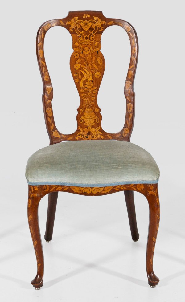 Mahagoni, massiv und furniert sowie Einlagen aus Ahorn. Bombierte Zarge auf geschwungenen Beinen mit kissenartigen Enden. Gewölbte, balusterartig durchbrochene Rückenlehne. Flächendeckende Einlegearbeiten aus unterschiedlichen Blütenranken, Blattvoluten und Vögeln. Sitzfläche gepolstert und bezogen. Sitz-H. 47 cm.
