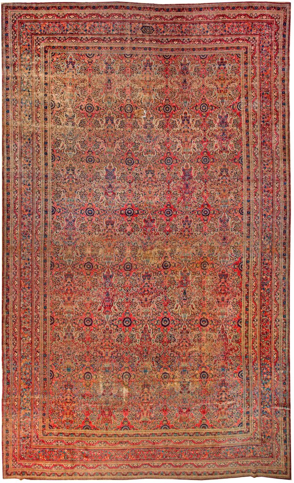 Persien. Wohl Keschan. 19. Jh.; Korkwolle auf Baumwolle. Feine Knüpfung. Naturfarben. Im Innenfeld flächendeckend dichte mosaikartige Musterung aus gereihten Kartuschenmotiven in unterschiedlichen Rot- und Beigetönen im Rapport. Umlaufend breite vielteilige Bordüre mit Palmettenranken und schmalen Bändern. Sign.; Alters- und Gebrauchsspuren. Besch.; 389 cm x 660 cm.
