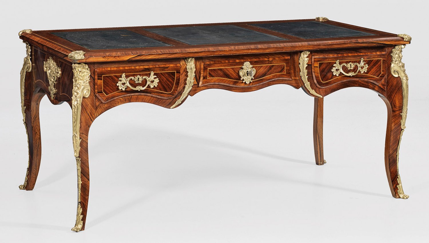 Palisander, furniert sowie Fadeneinlagen aus unterschiedlichen Hölzern. Passig geschweifter Zargenkasten auf hohen, geschwungenen Beinen mit reliefplastischen Maskarons. In der gegliederten Front flaches Kniefach sowie drei Schubladen unterschiedlicher Größe. Rückseitig korrespondierende Blendschubladen. Gering überstehende Deckplatte mit eingelegter Arbeitsfläche aus dunkelgrünem Leder sowie reiche Applikationen aus vergoldeter Bronze. H. 78 cm. 163 cm x 86 cm.