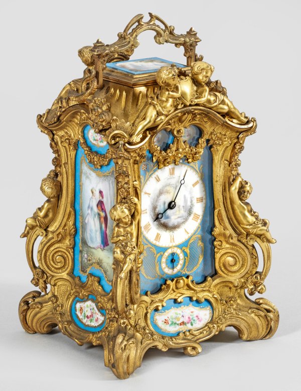 Bronze, vergoldet. Porzllanplaketten mit "bleu celeste-Fond" sowie goldornamentierten Reserven mit polychromen, teilw. szenisch gestalteten Reserven aus wandelnden Freundespaaren in lichten Waldlandschaften und Blütenarrangements. Hoher Korpus, flankiert von üppigen eingerollten Voluten mit vollplastischen Puttenkindern mit geschweift ansteigendem oberen Abschluss und Puttenbekrönung. Aufstellbarer Bügelhenkel. Verglastes Zifferblatt mit Weckanzeige, bez. Musy Pères & Fils Her. du Roi. Turis. Werk mit Echappementhemmung sowie Halbstundenschlag auf Tonfeder. Repetition. Werknummer 8068. Platine mit ovaler Marke "Reiseuhr" flankiert von den Großbuchstaben "D und C" für die Pariser Uhrmacher Pierre und Alfred Drocourt. Lederbespannte, besch. Schatulle mit Samtauskleidung sowie Label "Musy Pères & Fils Turin". Uhren-H. 23,5 cm.