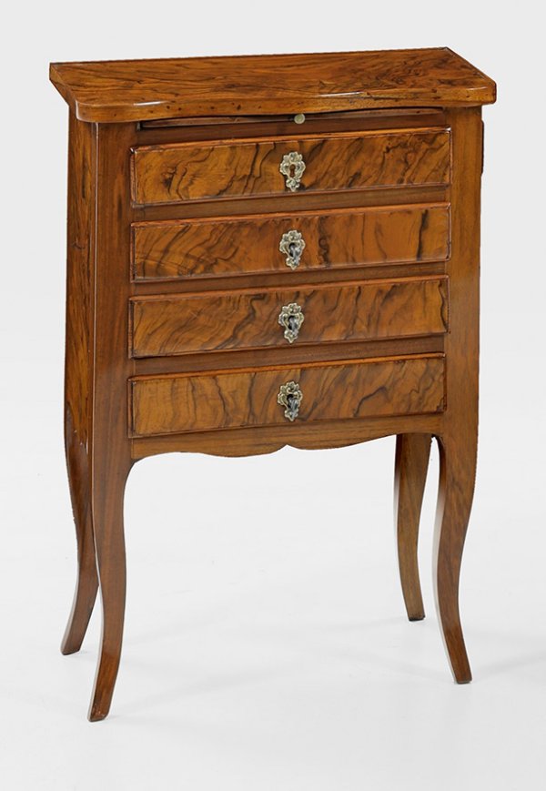 Nussbaum, furniert. Gerader, rechteckiger Korpus auf geschweiften Beinen. In der Front ausziehbare Abstellfläche sowie drei Schubladen und eine Blendschublade. Seitlich korrespondierendes Schubfach. Schauseitig geschweifte Deckplatte. Rest. mit Erg.; H. 67,5 cm. 47,5 cm x 29 cm.
