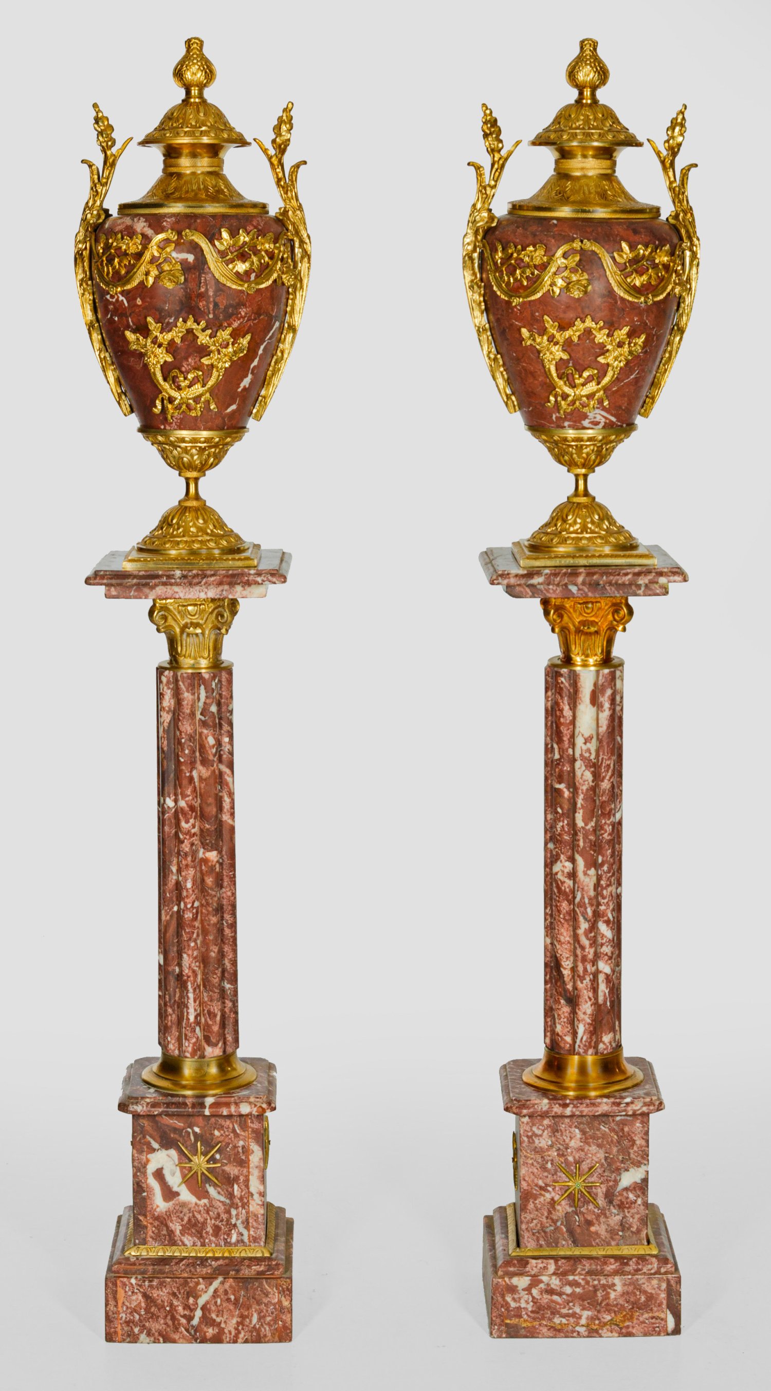 Roséfarbener, weiß gemaserter Marmor und vergoldete Bronze. Über hohem, profiliertem Sockel mit applizierten Sternmotiven schlanker godronierter Säulenschaft mit korinthischem Kapitell als Träger für quadratische Deckplatte. Oberhalb korrespondierende, balusterförmige Vasen mit gestreckten Henkeln aus stilisiertem Blattwerk sowie reichem Dekor aus Blütenmotiven und Draperiewerk. Ges.-H. 174 cm.