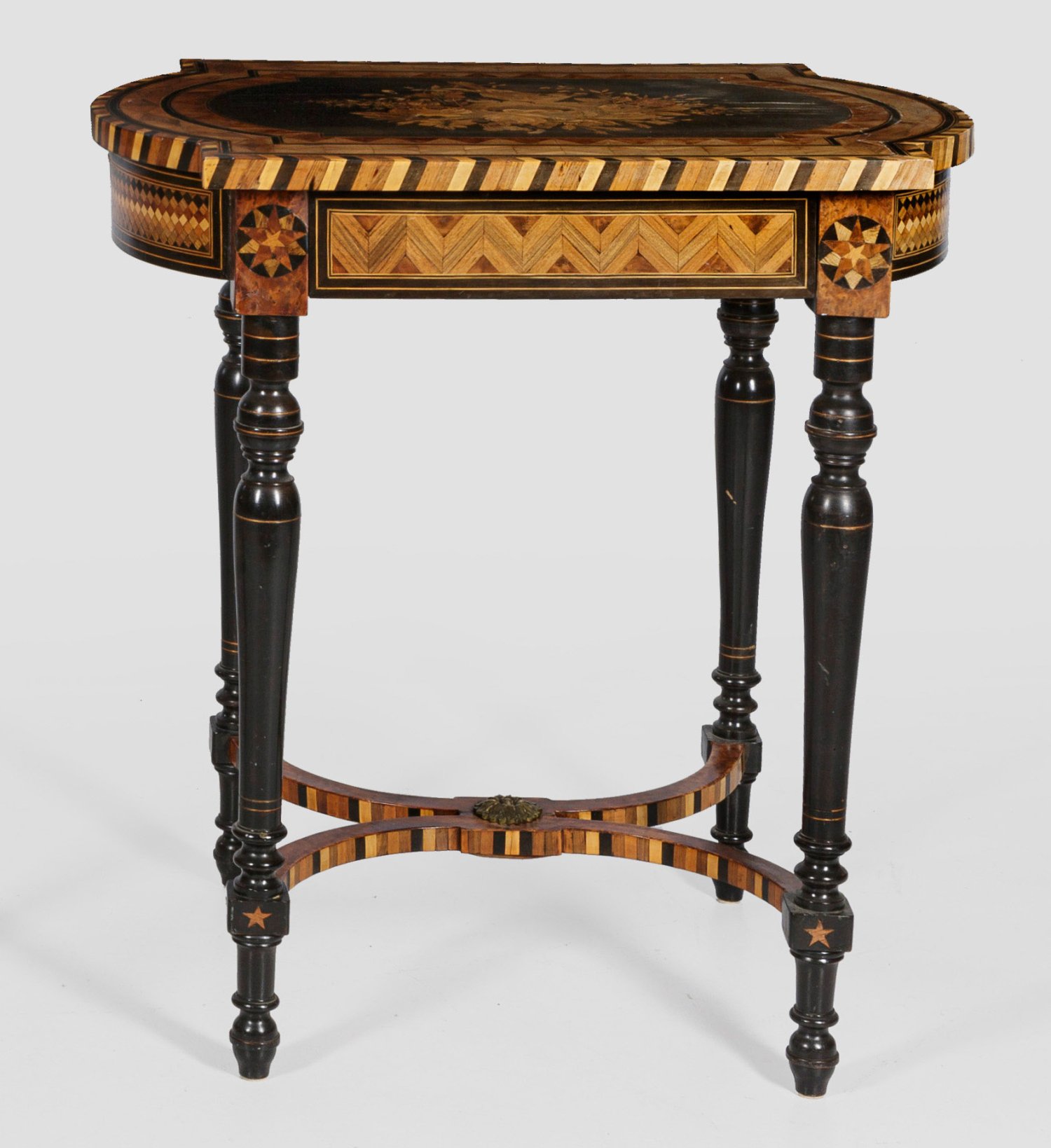 Nussbaum und Nussbaummaser, furniert sowie ebonisiert. Einlagen aus unterschiedlichen Edelhölzern. Gerader, seitlich stark bombierter, einschübiger Zargenkasten auf hohen, gegliederten Balusterbeinen, unterhalb durch gebogte Stege verbunden. Gering überstehende Deckplatte mit fein intarsierter Darstellung eines Vogels an seinem Nest, umgeben von unterschiedlichen Blüten. Mosaikartig angelegte Marketerie. Altersspuren. H. 71 cm. 67 cm x 48 cm.