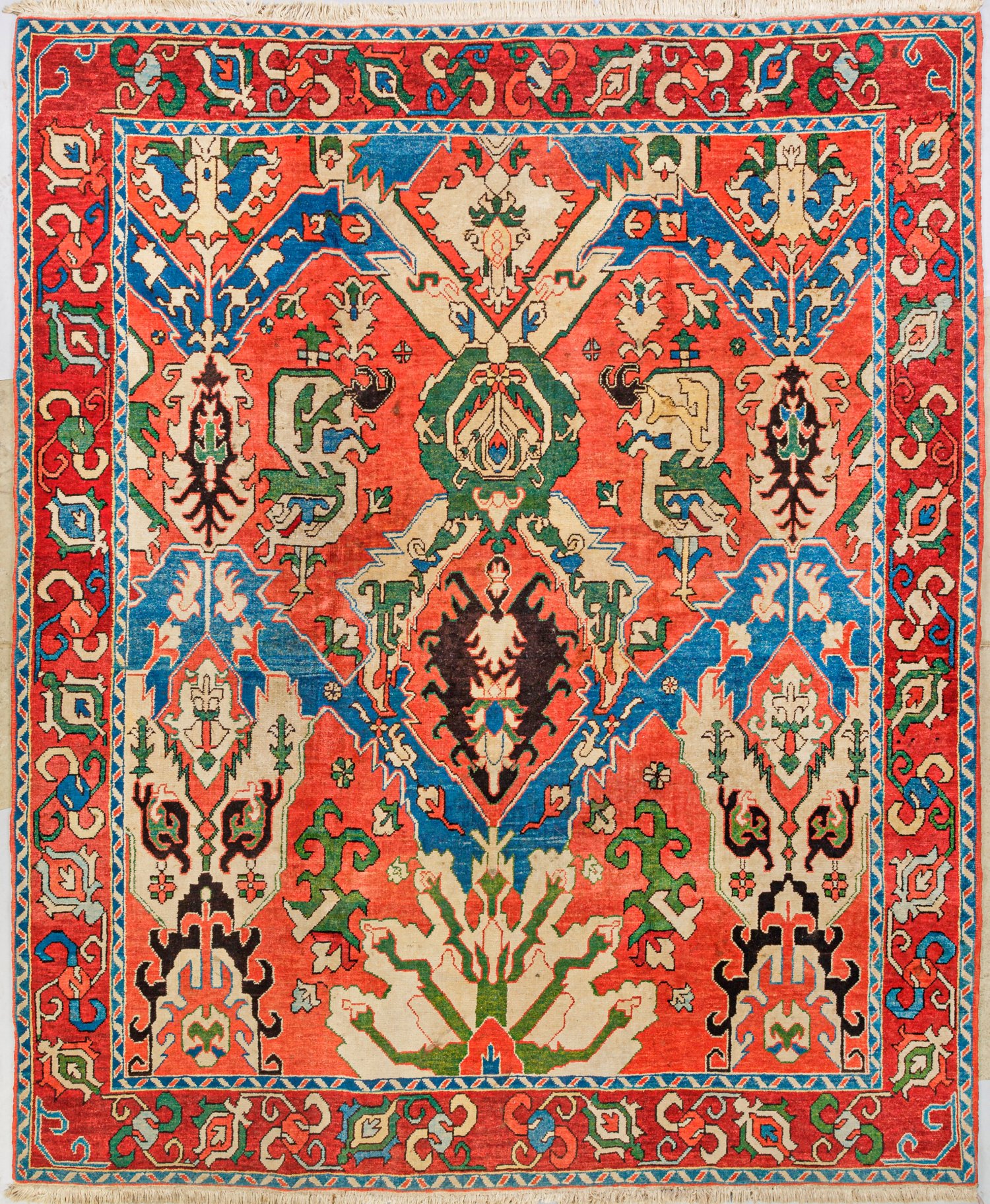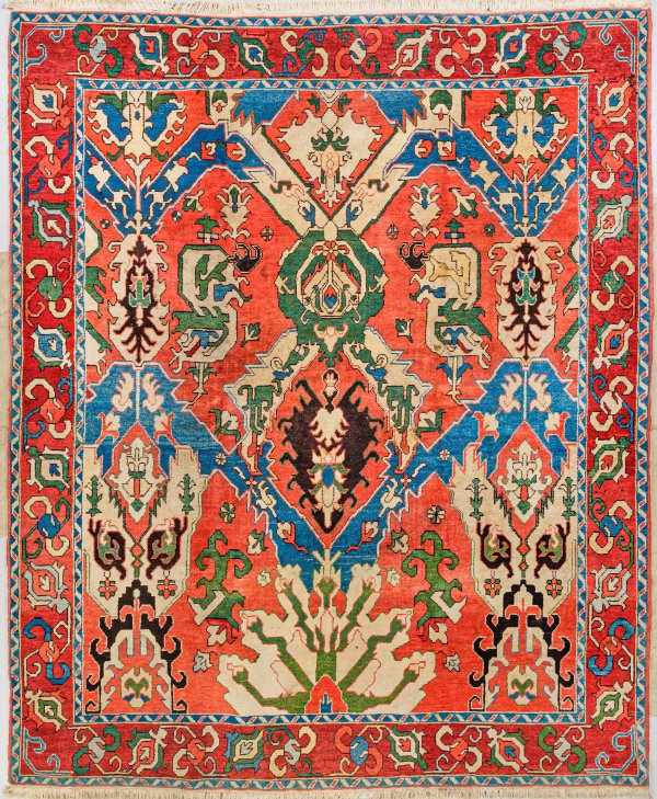 Aserbaidschan. Wolle auf Baumwolle. Im roten Innenfeld flächendeckend asymmetrisch angelegte Musterung aus unterschiedlichen Kartuschen- und Palmettenmotiven in Beige-, Blau- und Grüntönen. Umlaufend breite, rotgrundige Bordüre, flankiert von schmalen Bändern. 246 cm x 303 cm.
