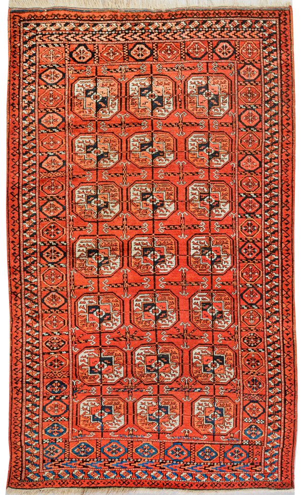 Afghanistan. Wolle auf Wolle. Im hellroten Innenfeld flächendeckende Musterung aus drei Reihen à sieben sog. Elefantenfuß-Göls. Umlaufend breite Bordüre. 198 cm x 117 cm.
