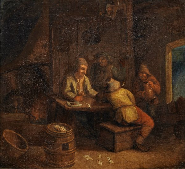 Ländliches Wirtshausinterieur mit zechenden und Karten spielenden Bauern