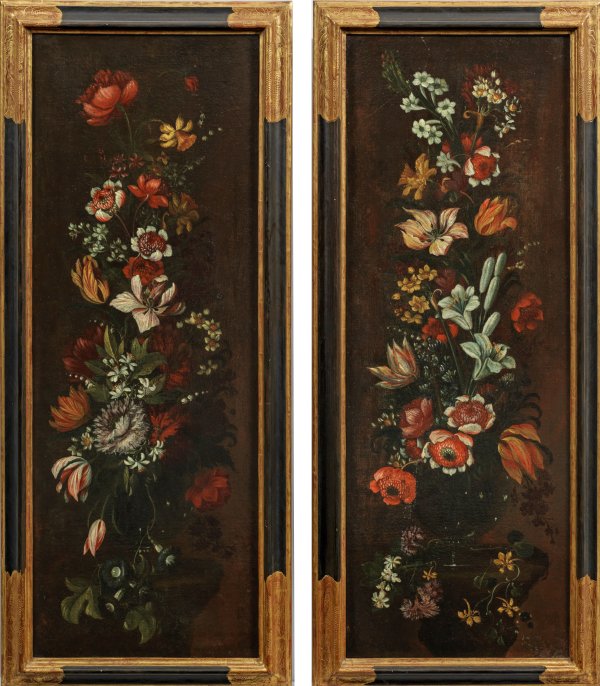 Im langgestrecktem Hochformat komponiertes Stillleben. Auf steinernen Säulenkapitellen arrangierte Glasvasen mit Buketts aus unterschiedlichen Frühlings- und Sommerblumen mit leuchtend farbigen, duftigen Blüten vor dunklem, braunem, neutralem Hintergrund. Die in der Tradition der Brueghel-Familie und anderer großer niederländisch-flämischer Stilllebenmaler stehenden Blumenstücke dürften - wofür auch das Format spricht, einst im Interieur eines Schlosses bzw. eines standesgemäßen, repräsentativen Hauses eines Patriziers oder wohlhabenden Bürgers gehangen haben. Öl/Lwd.; 96 cm x 35,5 cm. Rahmen.