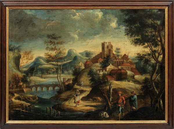 Blick auf eine bergige Fantasielandschaft, auf der rechten Bildseite ein Dorf mit altem, mittelalterlichen Burgturm, auf der linken Seite ein Flusslauf mit einer fünfbogigen Steinbrücke und Gondel; als Figurenstaffage im Vordergrund ein stehender Husar in leuchtender, rot-blauer Uniform und ein Hirte, mittig eine junge Frau mit Korb auf dem Kopf und ein wandernder Mann, der ein Bündel an seinem Stock über der Schulter trägt. Das Gemälde verbindet vielfältige Einflüsse mehrerer in Rom tätiger italienischer und flämischer Maler wie Gaspard Poussin (bzw. Gaspard Dughet, 1615 - 1675), Pieter van Bloemen (1657 - 1720) und Jan Frans van Bloemen (1662 - 1749) mit denen der dortigen Bamboccianti wie Michelangelo Cerquozzi (1602 - 1660). Öl/Lwd., doubl.; 63 cm x 117 cm. Rahmen.