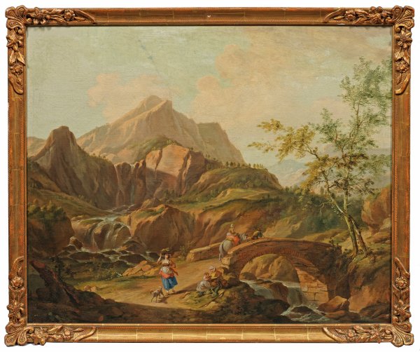 Der bedeutende Schweizer Maler lernte zunächst bei Johann Melchior Füssli und Johannes Simler, 1732-1735 arbeitete er im Atelier von Giovanni Battista Tiepolo in Venedig. Danach setzte er seine Wanderjahre in der Schweiz, Deutschland und Amsterdam fort, bis er 1741 nach Zürich zurückkehrte. Dort erhielt er rasch Aufträge für Landschaftsmalereien und gemalte Leinwandbespannungen, mit denen die Züricher Kaufherren- und Magistratenfamilien ihre Räumlichkeiten sogar als ganze Landschaftszimmer repräsentativ ausschmücken ließen. Wie auch beim vorliegenden Gemälde versah Bullinger die Rückseiten seiner Werke oft mit einer Werk-Nr., seiner Signatur und der Datierung. Öl/Lwd.; Verso sign. u. dat. 1764 sowie mit Werk-Nr. 384. Rest.; 72 cm x 90 cm. Rahmen.