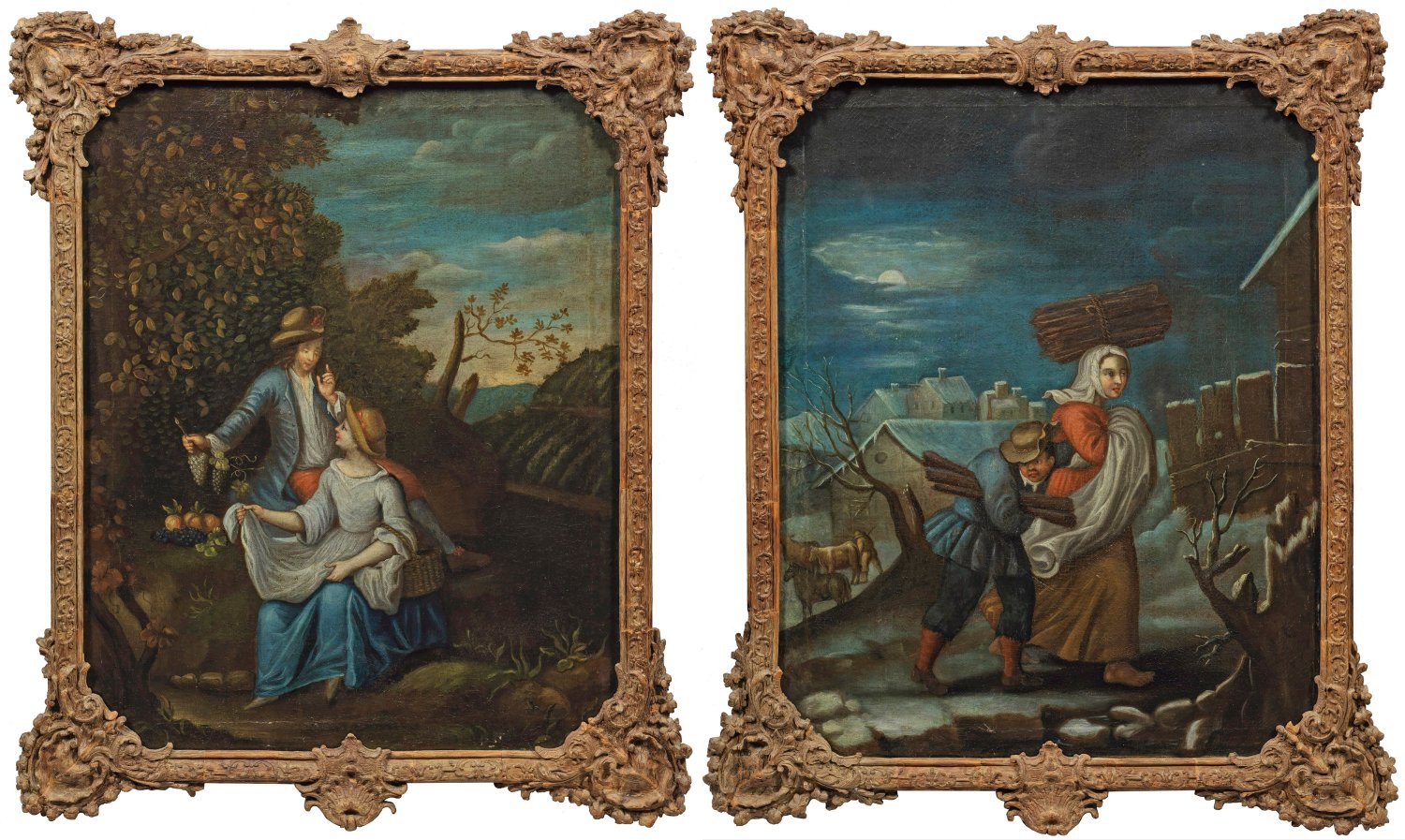 Als Pendant. Szenische Darstellungen, der von "Herbst" mit jungem Paar beim Traubenpflücken und der "Winter" mit bäuerlichem Paar beim Tragen von Feuerholz in einer verschneiten Landschaft mit Dorf im Mondlicht. Öl/Lwd.; Rest.; Verso auf dem Keilrahmen jeweils Brandstempel "FW". 90 cm x 71 cm. Aus dem vollen Holz geschnitzter Original-Rokoko-Rahmen.