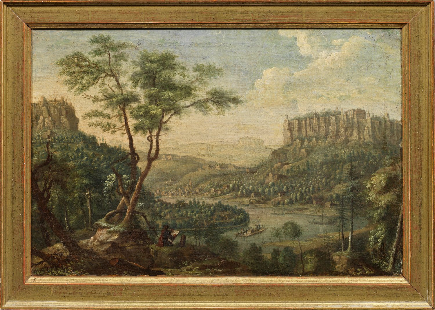 Blick von einer Anhöhe auf die Elbe mit Floßschiffer und Königstein, im Vordergrund das Selbstbildnis Thieles beim Malen in Rückenansicht, neben ihm ein sitzender Hund. Im umfangreichen Oeuvre Thieles, der ab 1738 als Hofmaler in Dresden wirkte, lassen sich mehrere Königstein-Ansichten nachweisen, u. a. in der Gemäldegalerie Alte Meister in Dresden (Inv.-Gal.-Nr. 3585) und im Staatl. Museum in Schwerin. 1726 schuf Thiele dieselbe Vedute (Komposition) wie bei diesem Gemälde als Radierung unter dem Titel "Prospect der Chur Sächsischen Bergvestung Königstein (...) von der abend Seite" als Blatt 2 der sechsteiligen Folge "Ansichten aus der sächsischen Schweiz". Öl/Lwd. doubl.; Restaurierungsbedürftig; 36 cm x 54,5 cm. Rahmen.