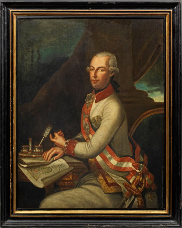 Repräsentatives, halbfiguriges Bildnis des an seinem Schreibtisch vor einer Landkarte sitzenden, 1765-1790 regierenden Kaisers in weißer Uniform, als Großmeister des Orden vom Goldenen Vlies sowie mit Schärpe in rot-weißen Landesfarben. Hickel, der 1771 zum kaiserlich-königlichen Kammermaler ernannt wurde, schuf zahlreiche Porträts des Kaisers, um 1780-1785 auch mehrere vergleichbare Bildnisse des Kaisers am Schreibtisch (u. a. ein Gemälde Hickels im Johanneum, Graz). Öl/Lwd., auf eine Platte kaschiert; 116 cm x 90 cm. Rahmen der Zeit oder Original-Rahmen.