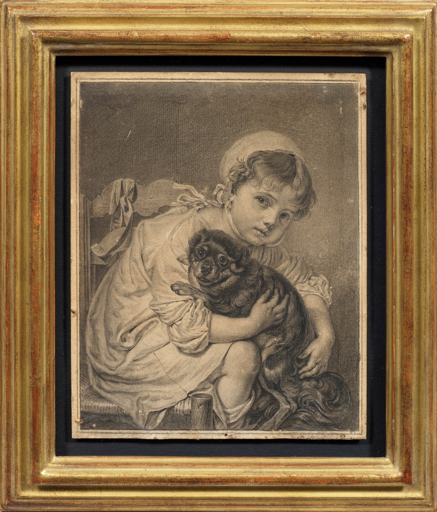 Darstellung eines auf einem Stuhl sitzenden Mädchens, wohl die dritte Tochter von Jean-Baptiste Greuze Louise-Gabrielle (geb. 1764), einen Spaniel haltend. Das in feiner Grisaillemalerei ausgeführte, hier vorliegende Kabinettbild greift eine beliebte Gemäldekomposition von Jean-Baptiste Greuze auf, die vermutlich 1767 im Pariser Salon ausgestellt wurde und sich heute in Londoner Privatbesitz befindet. Die Darstellung erfreute sich großer Nachfrage und wurde von Greuze selbst mehrfach wiederholt (eigenhändige Repliken u. a. im Musée d'Art et d'Histoire in Toulon und im Civico Museo d'Arte antica in Mailand). Die von seiner Tochter Anne-Geneviève Greuze (1762 - 1842) geschaffene Version besitzen die Staatl. Museen in Berlin. Tuschfeder mit Bleistift u. Weißhöhungen/Papier. R. u. undeutl. bez.; Rand beschnitten, Nadellöcher. Ca. 22,2 cm x 18,3 cm.