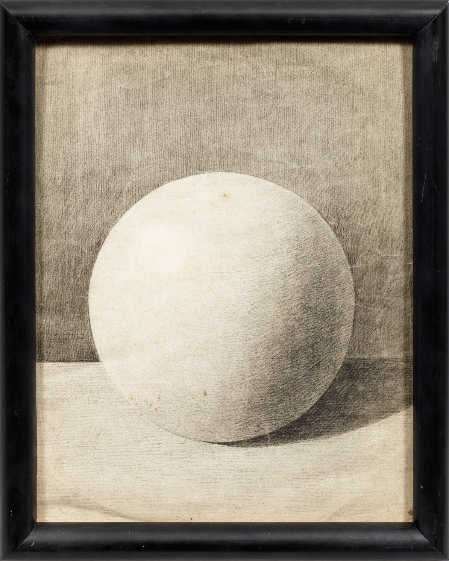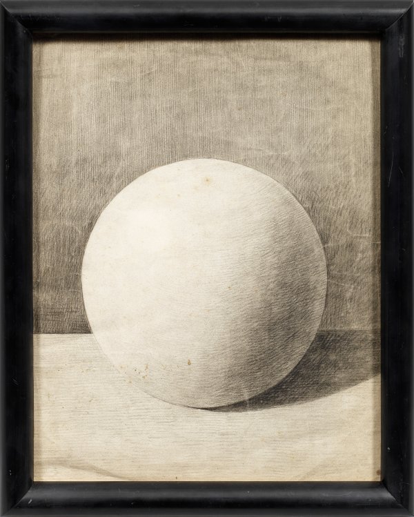 Formstudie einer Kugel, die durch feine Schraffuren Licht- und Schattenkontraste subtil wiedergibt. Ersten Zeichenunterreicht erhielt Fries bei Carl Heinrich Koopmann (1797-1894) am Polytechnikum in Karlsruhe. Auf dessen Rat hin ging er 1835 zum Akademiestudium nach München. Wie drei vergleichbare geometrische Studien Fries' nahelegen, stammt das vorliegende Studienblatt vermutlich aus eben dieser Münchener Studienzeit. Bleistift u. Kohle/Papier. Verso mit zweifacher Künstlerangabe. Ger. stockfleckig. 40,7 cm x 32,1 cm. Rahmen.