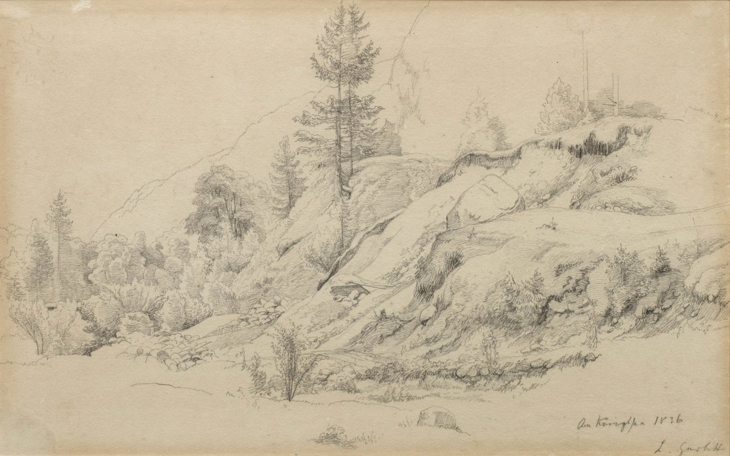 Frühe Landschaftszeichnung Gurlitts, der 1828-1832 Schüler und Gehilfe von Siegfried Detlev Bendixen war und danach 1832-1834 an der Königlich Dänischen Kunstakademie in Kopenhagen studierte, wo er durch Christoffer Wilhelm Eckersberg und Johann Ludwig Lund seine Passion für die Landschaftsmalerei entwickelte. Bleistift/Papier. R. z. sign., dat. 1836 u. betitelt. 21 cm x 33 cm (Passepartoutausschnitt). Rahmen.