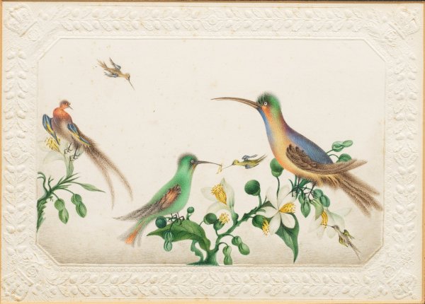 Querrechteckiges Bildfeld, abgeschrägte Ecken, feinmalerische, detailreiche Darstellung in Aquarelltechnik; das Papier mit geprägter Rahmung aus Eichenlaub, in den Ecken die St. Edwards-Krone und Symbole für das Vereinigte Königreich von Großbritannien und Nordirland - Tudor-Rose (England), Disteln (Schottland) und Kleeblätter (Irland). M. u. dat. 1839. Verso auf dem Rückenkarton bez./attr. "gemalt von der Prinzessin von Kent". Ca. 18 cm x 25,2 cm (Passepartoutausschnitt). Rahmen.
